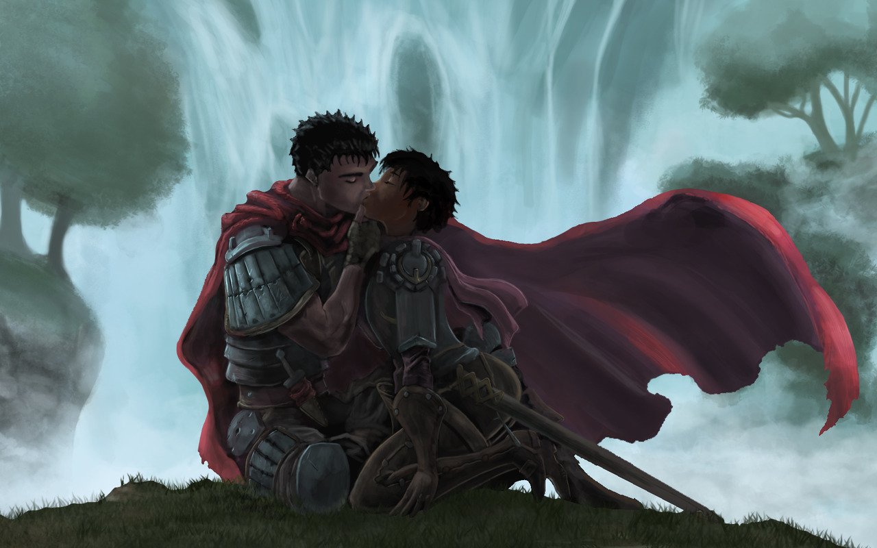 Description: A couple of people sitting on top of a hill next to a waterfall with a red cape on their shoulders.