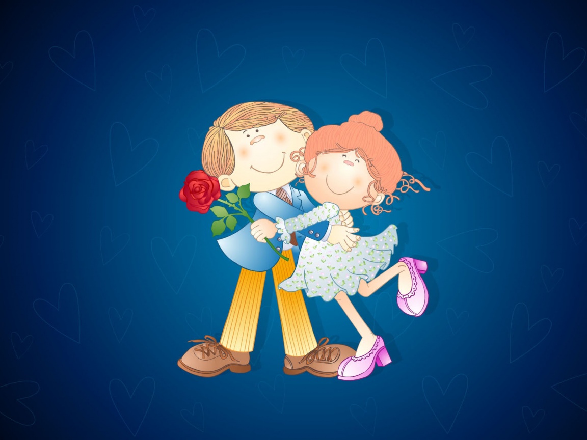 Description: A couple of people that are hugging each other on a blue background with hearts and a rose in the middle.