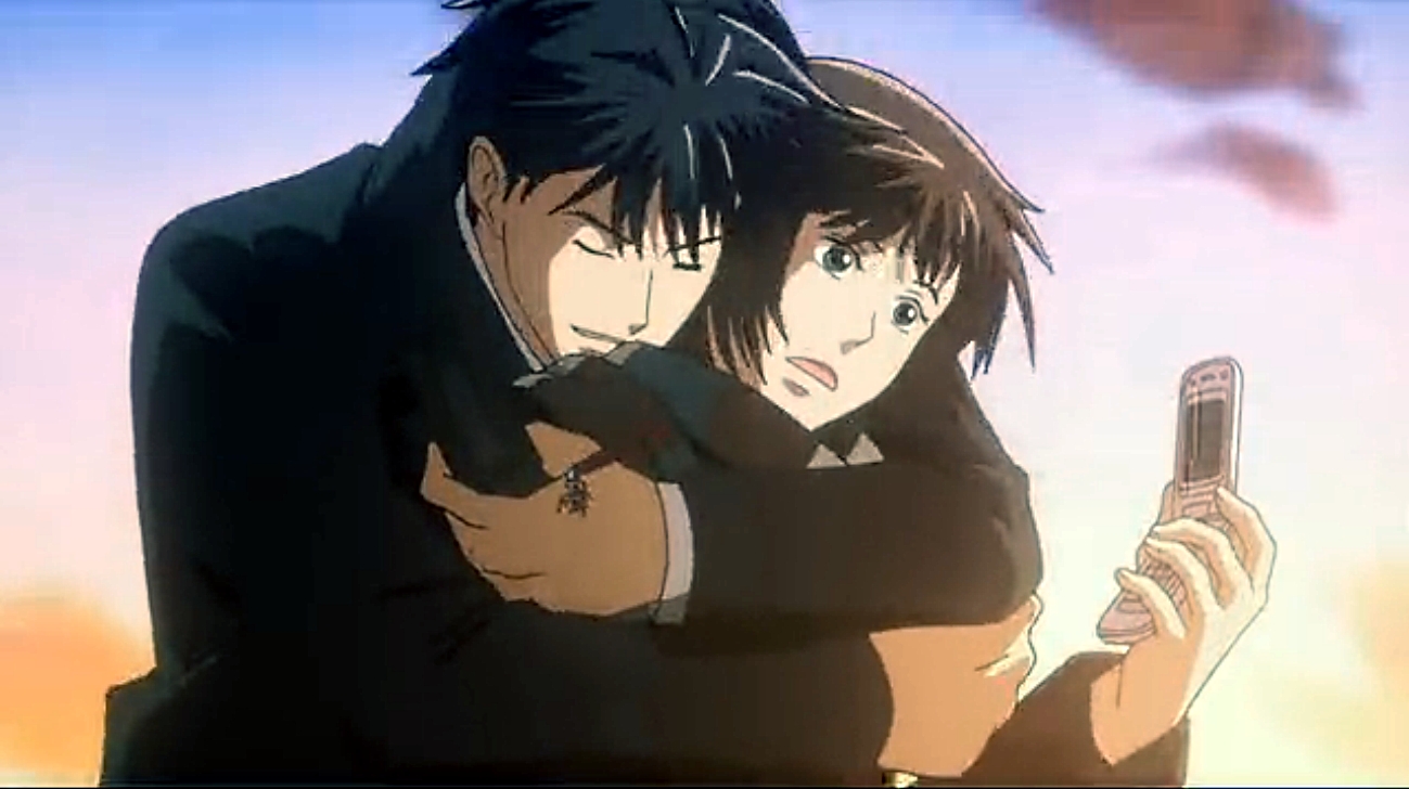 Description: A couple of people that are hugging each other with a cell phone in their hand and a sky background.