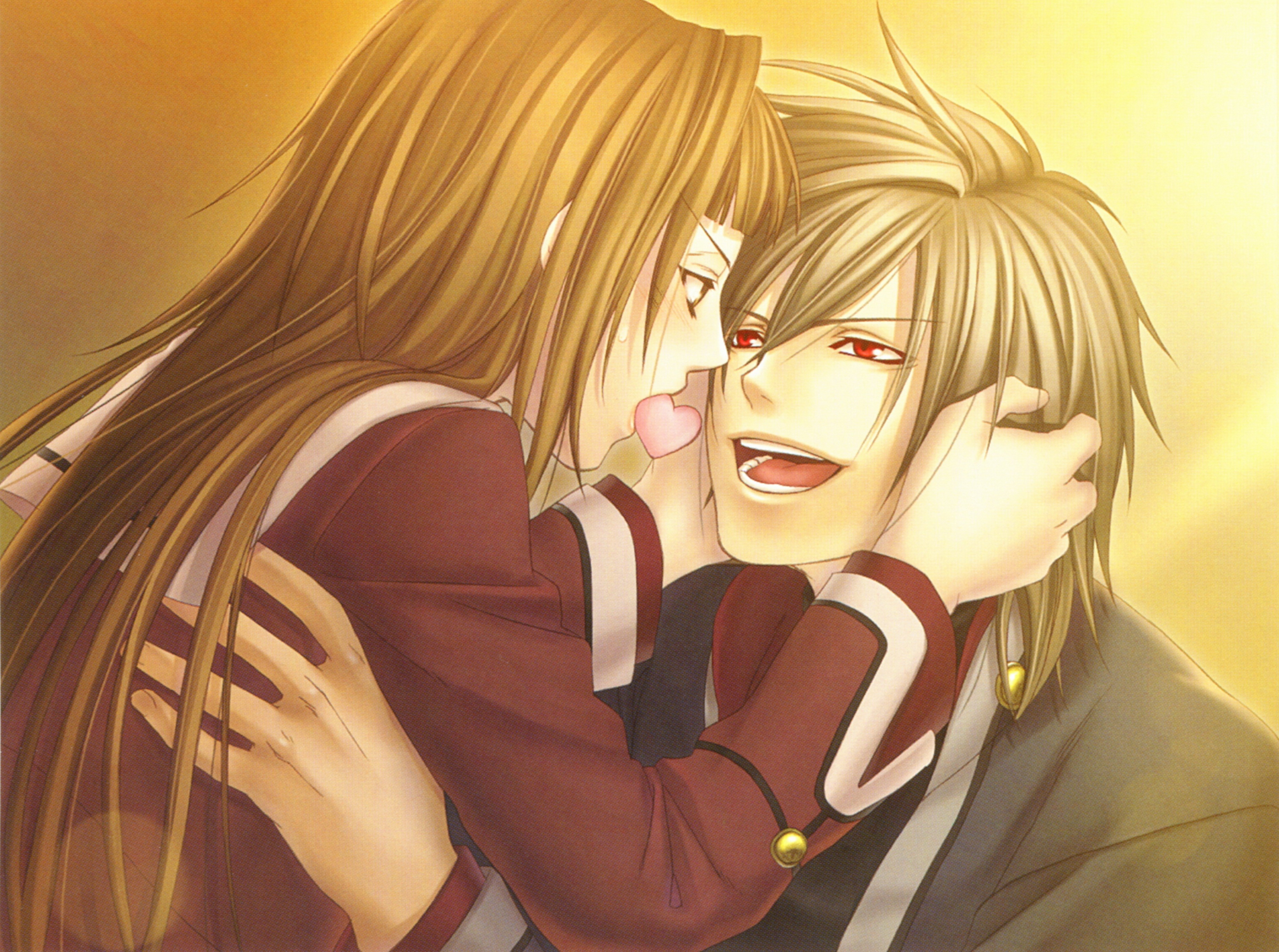Description: A couple of people that are hugging each other in a picture with a yellow background and a yellow light.