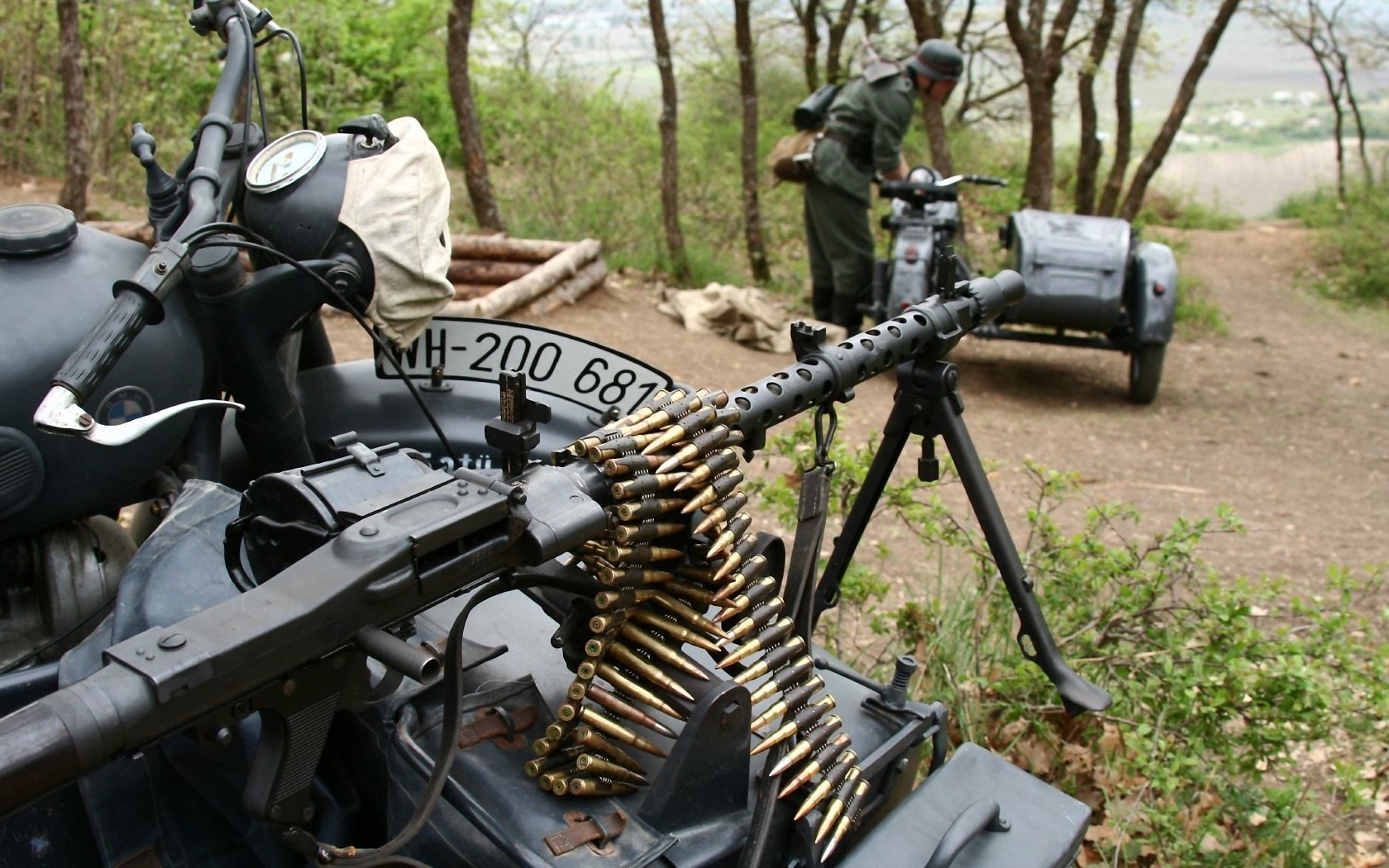 Description: A couple of men standing next to a motorcycle with guns on it's back end and a gun on the back end of the bike.