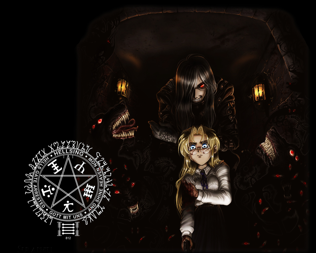 Description: A couple of people standing next to each other in a room with a pentagramil on the wall.