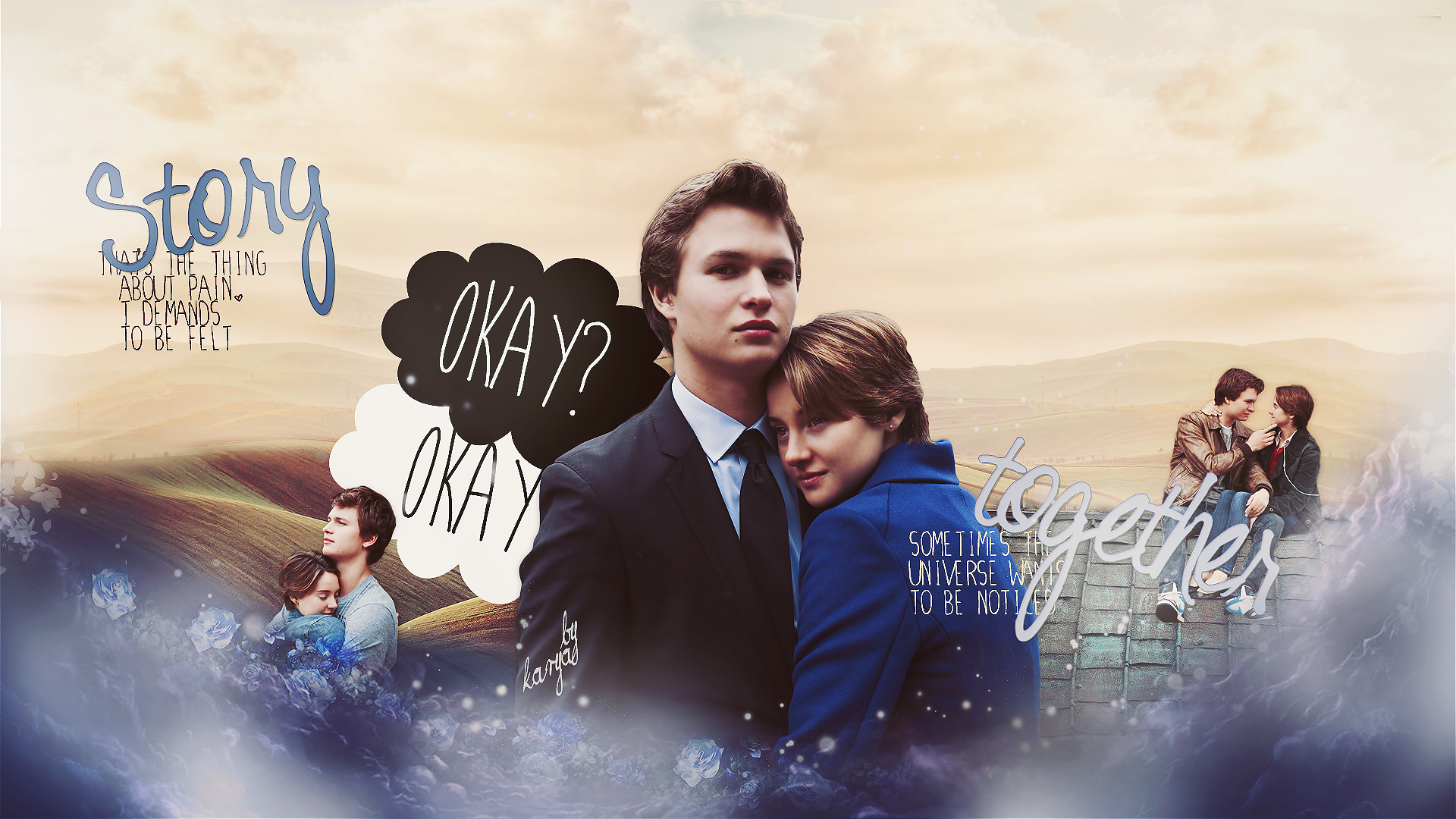 Description: A couple of people that are standing in the grass with a sky background and clouds above them and a picture of a man and woman.