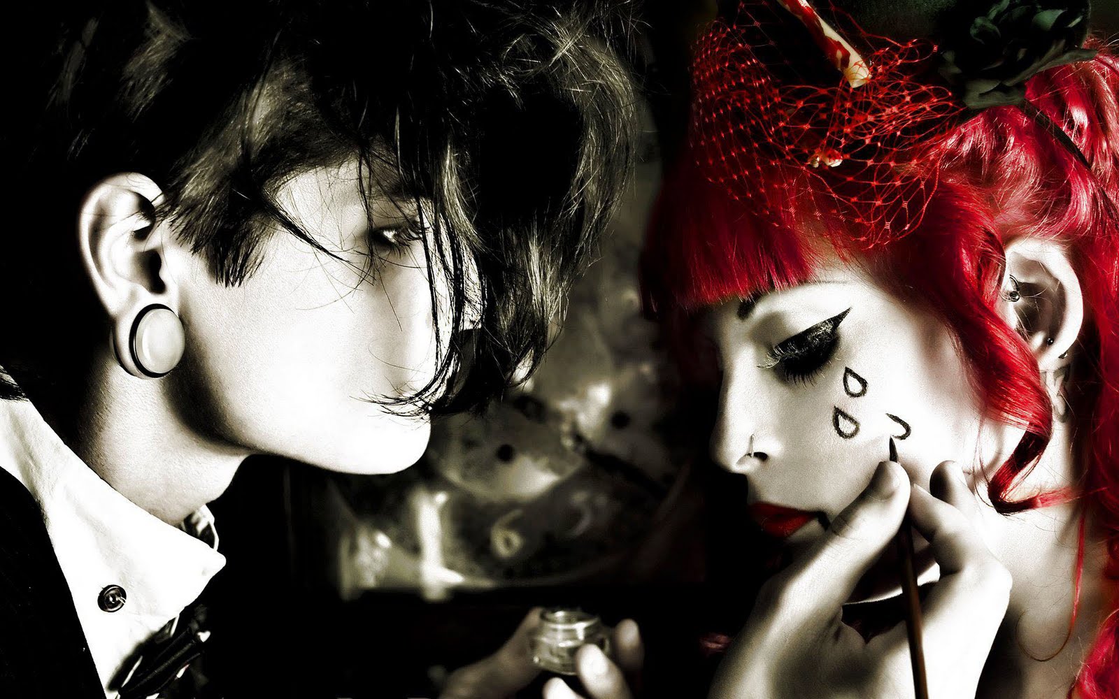 Description: A couple of people with makeup and makeup on their faces and face paint on their faces and noses.