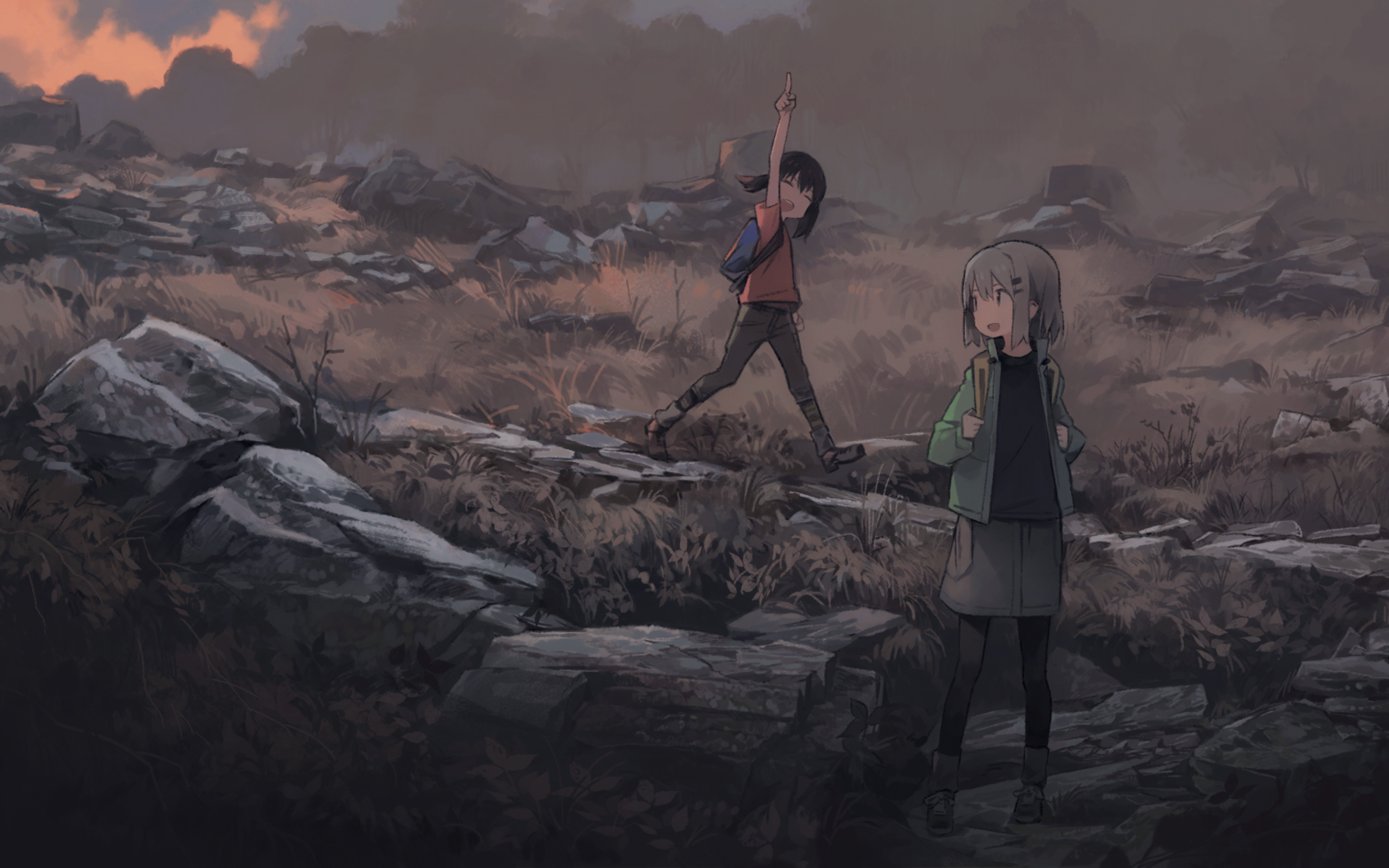 Description: A couple of people standing on top of a rocky hillside next to a forest filled with trees and bushes.