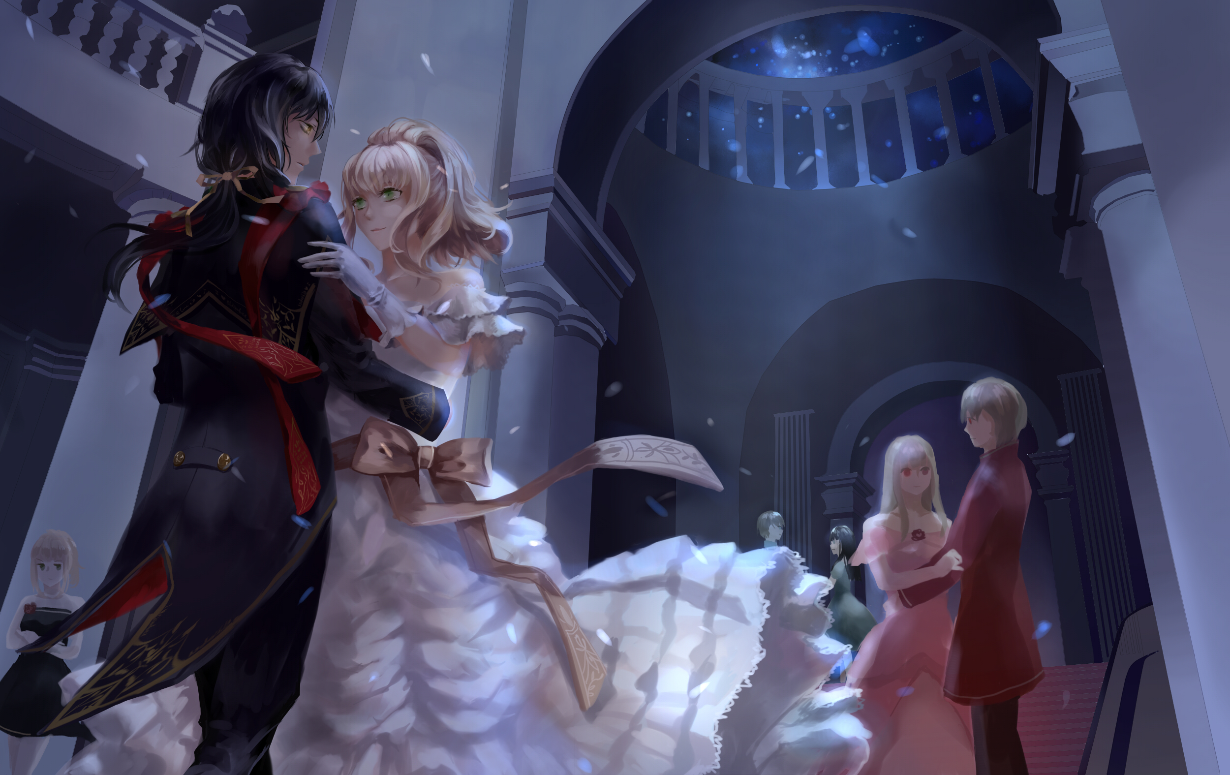 Description: A couple of people that are standing in a room together with a dress on and a man in a suit.