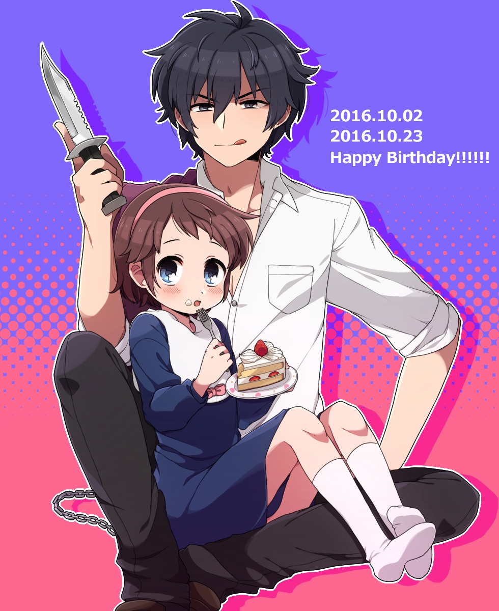 Description: A couple of people sitting next to each other holding a knife and a plate of food on a table.