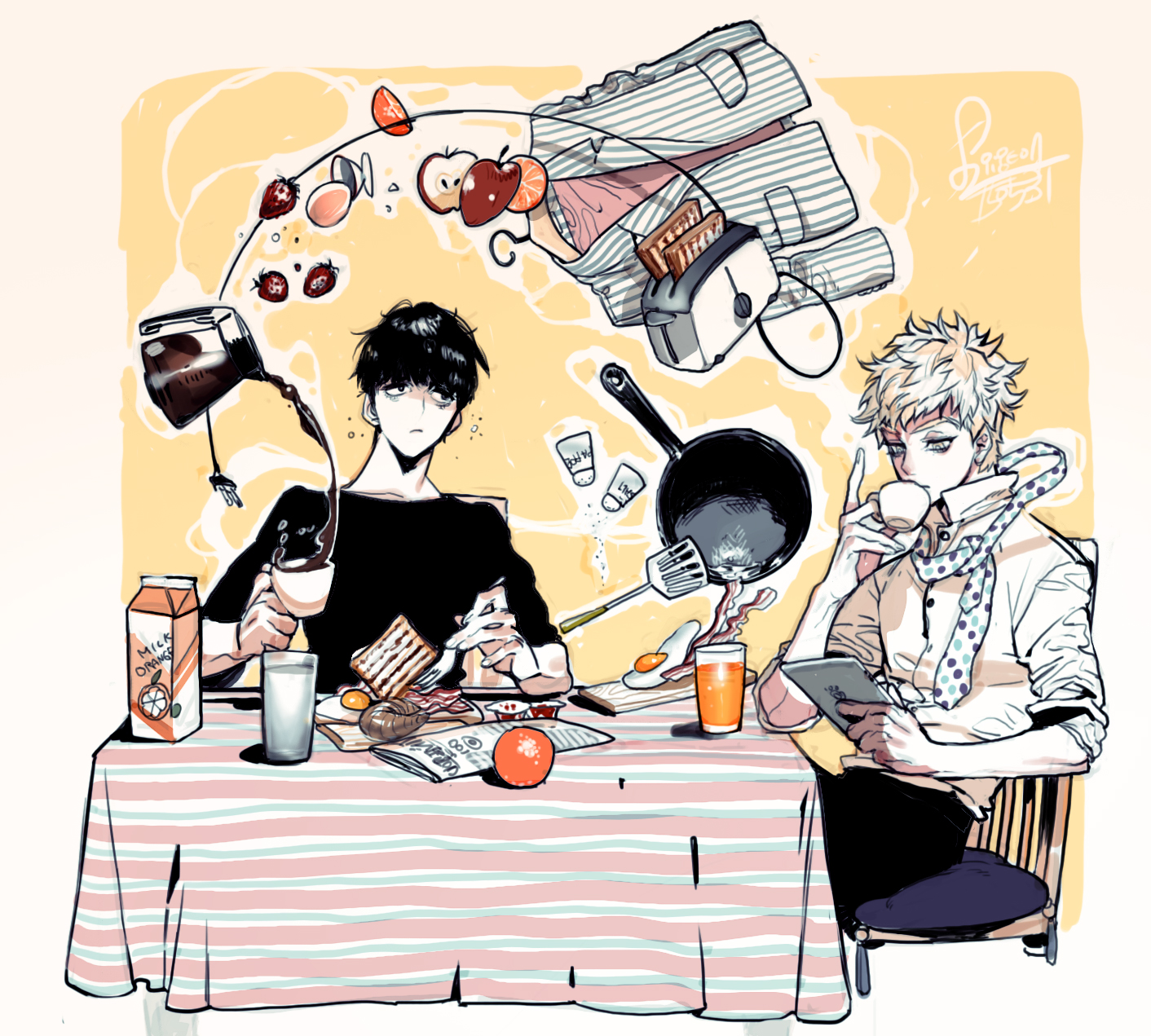 Description: A couple of people sitting at a table with food and drinks in front of them and a fan behind them.