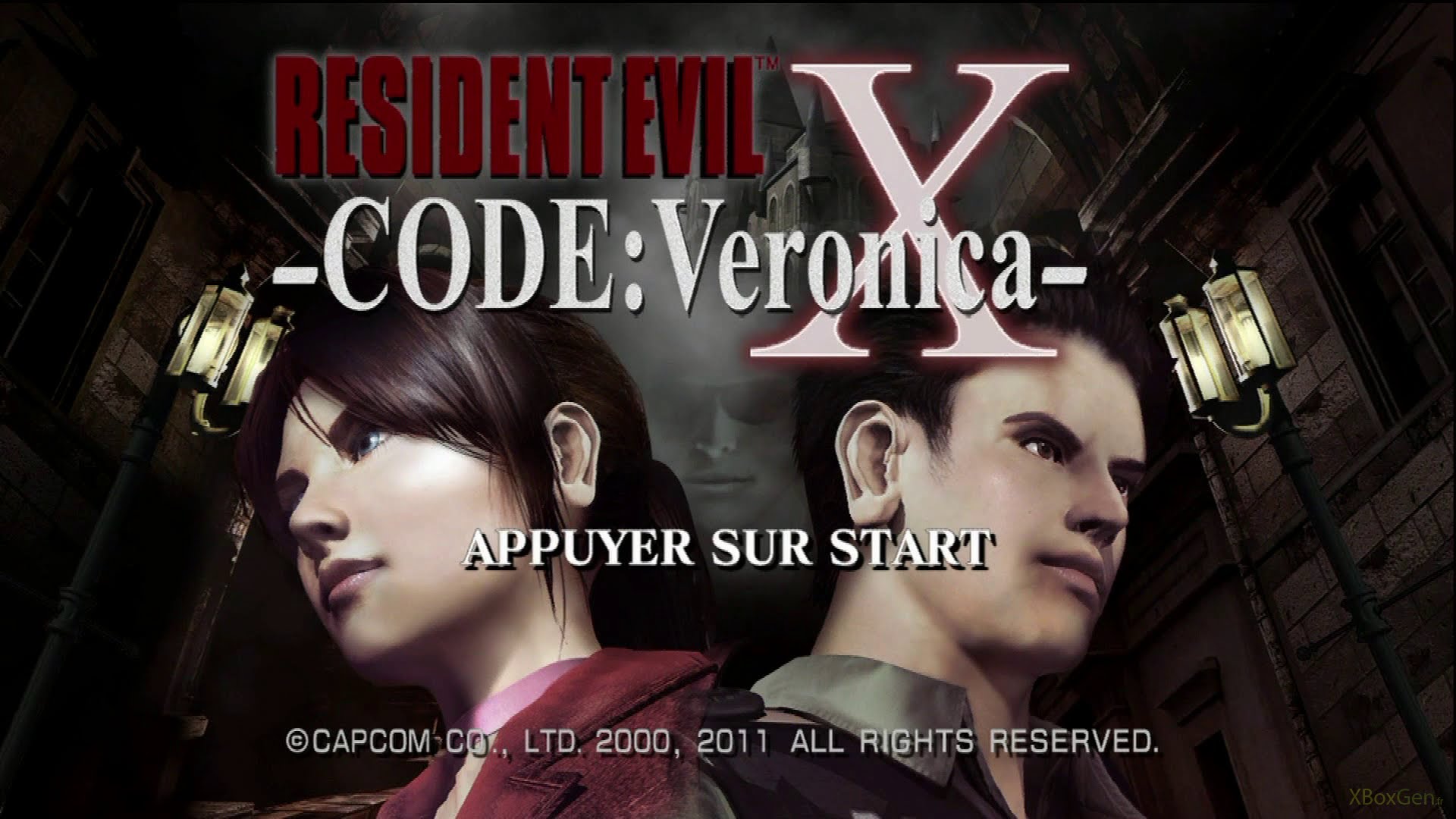 Description: A couple of people standing next to each other in front of a building with the words resident evil code veronica.