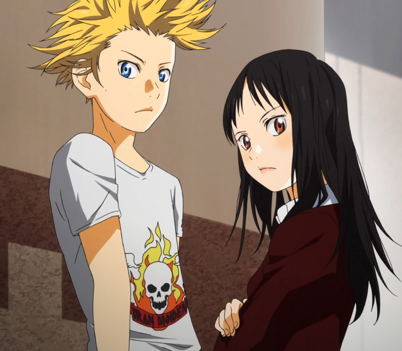 Description: A couple of people standing next to each other in a room with a wall behind them and a skull on the wall.