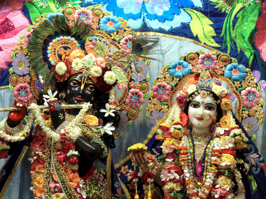 Description: A couple of people that are standing up together in front of a wall with flowers on it and a statue of a god.