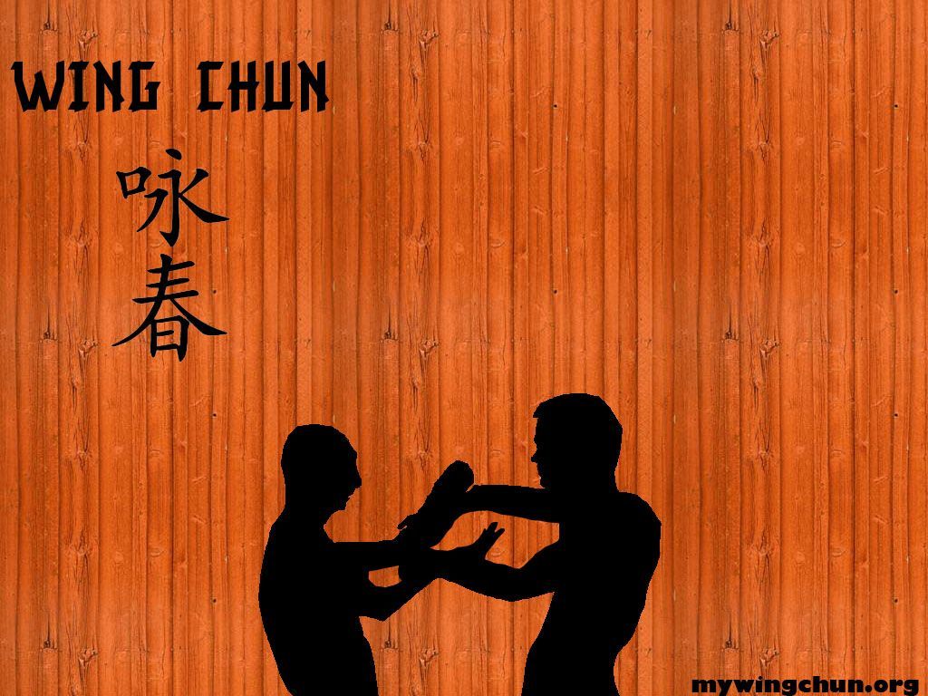 Description: A couple of people that are standing in front of a wall with a sign on it that says wing chun.