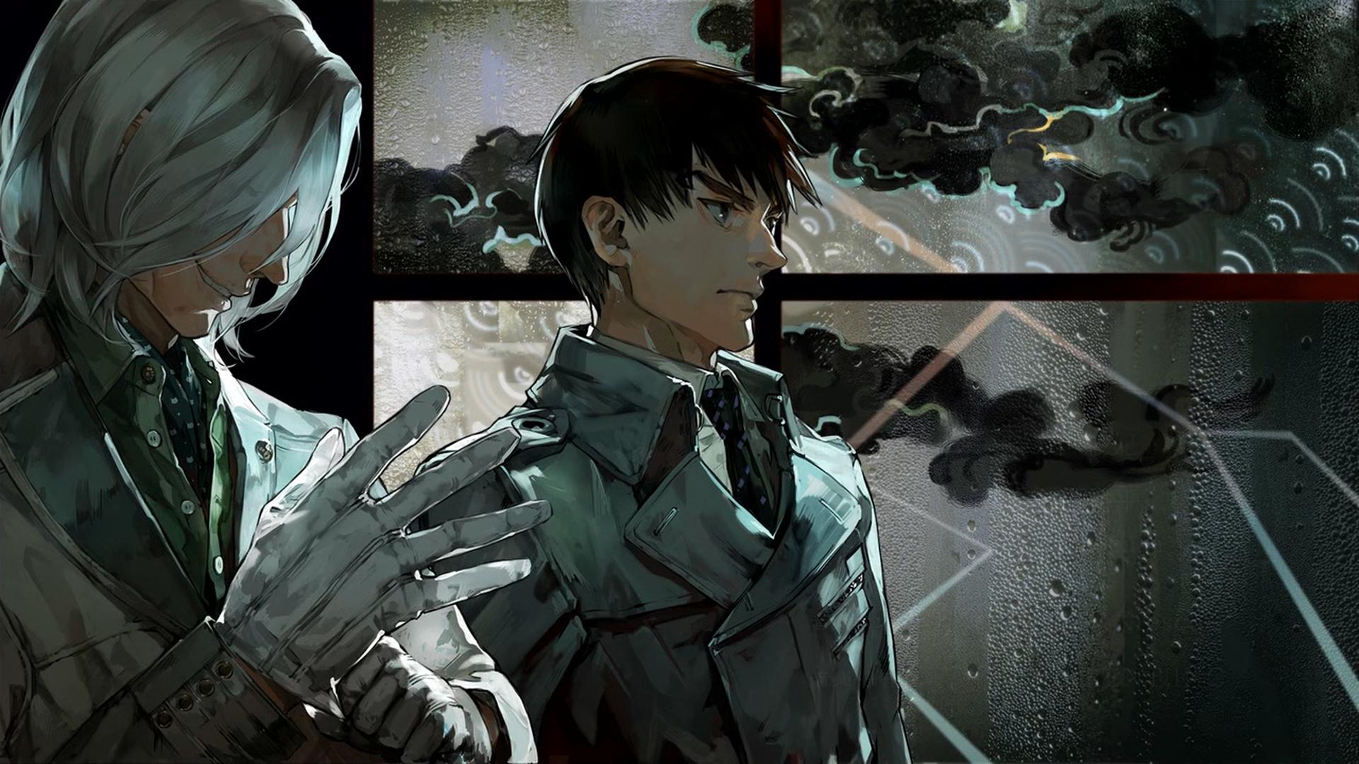 Description: A couple of people standing next to each other in front of a window with smoke coming out of it.