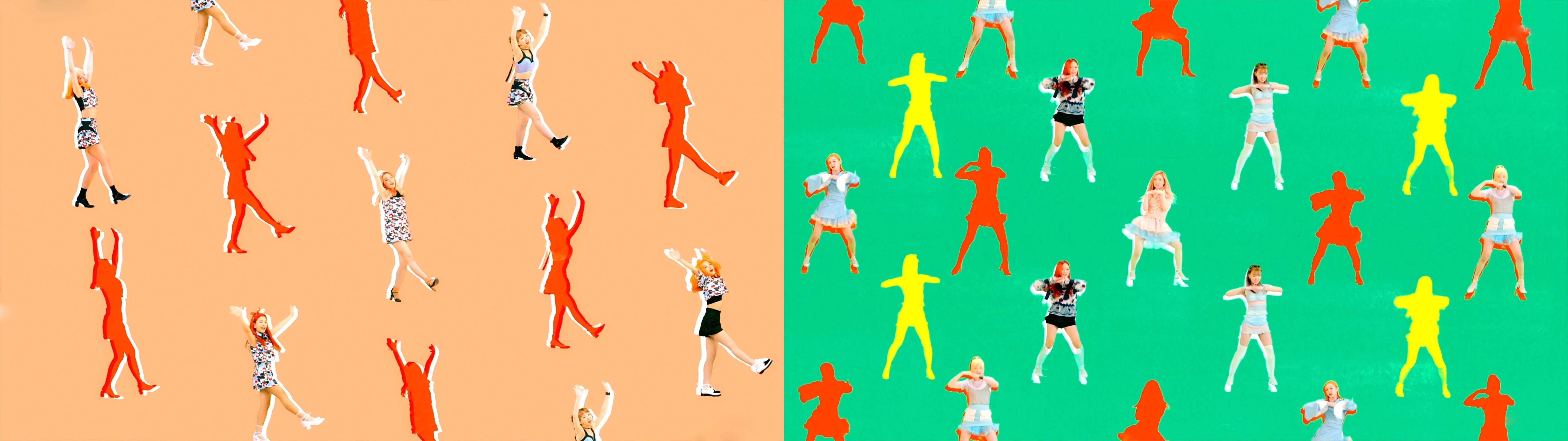 Description: A couple of pictures of people in different outfits and colors of the same person on a green and orange background.