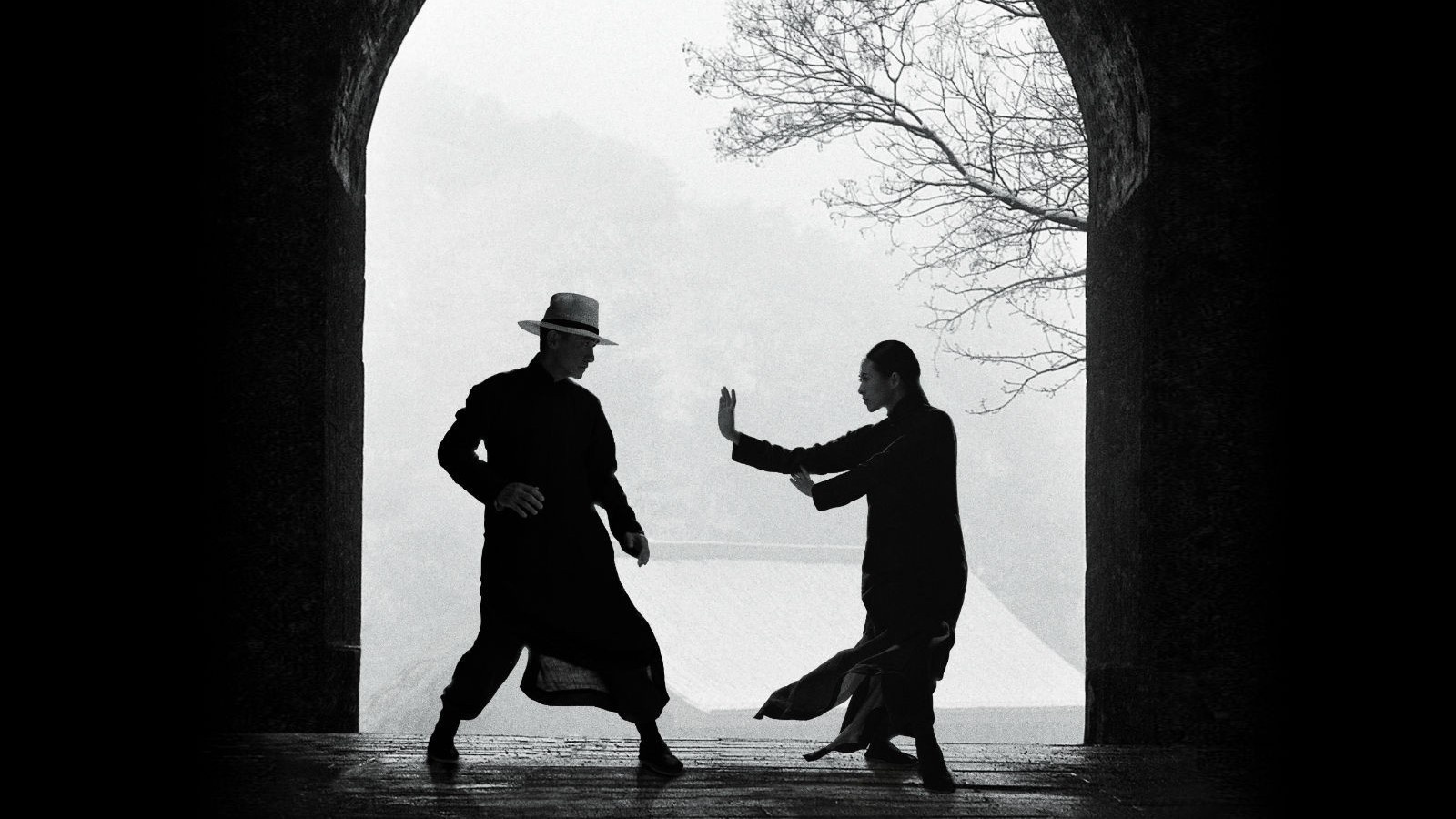 Description: A couple of people that are standing in the rain together in a doorway with a tree in the background.