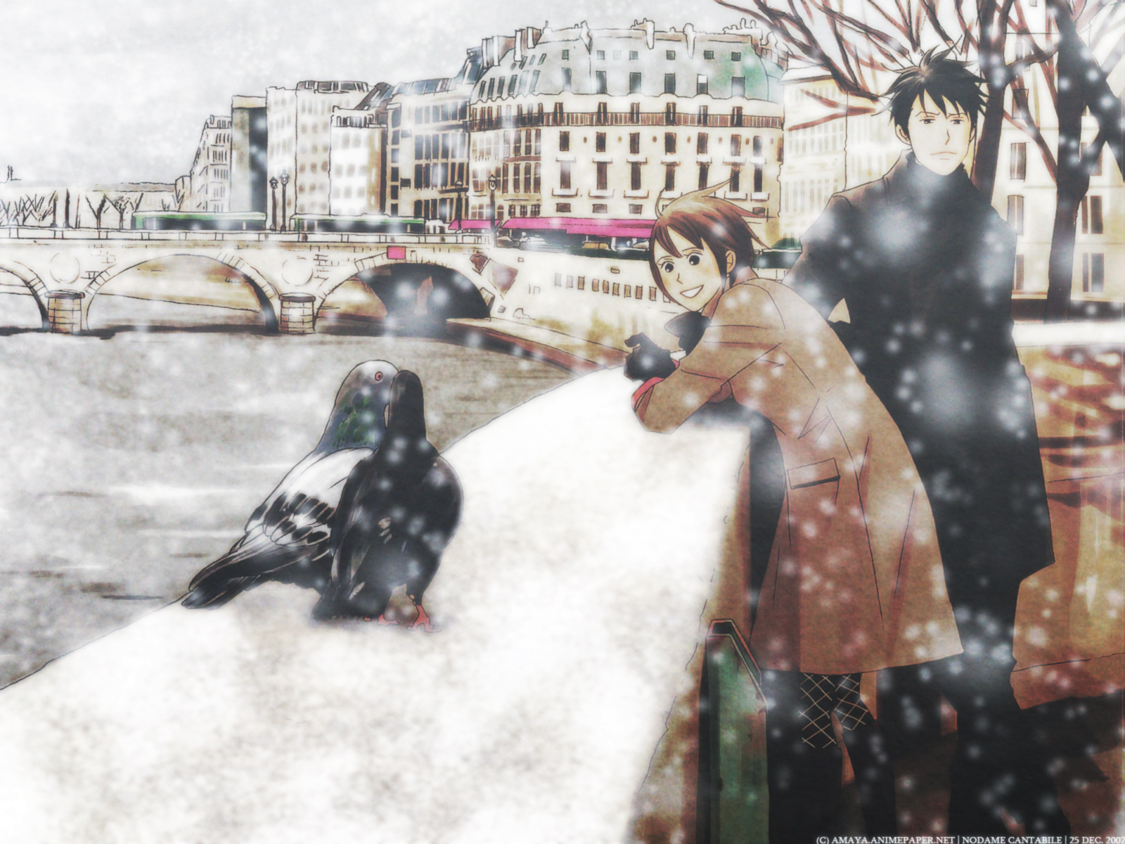 Description: A couple of people standing next to a river with a bird on it's side and a bridge in the background.