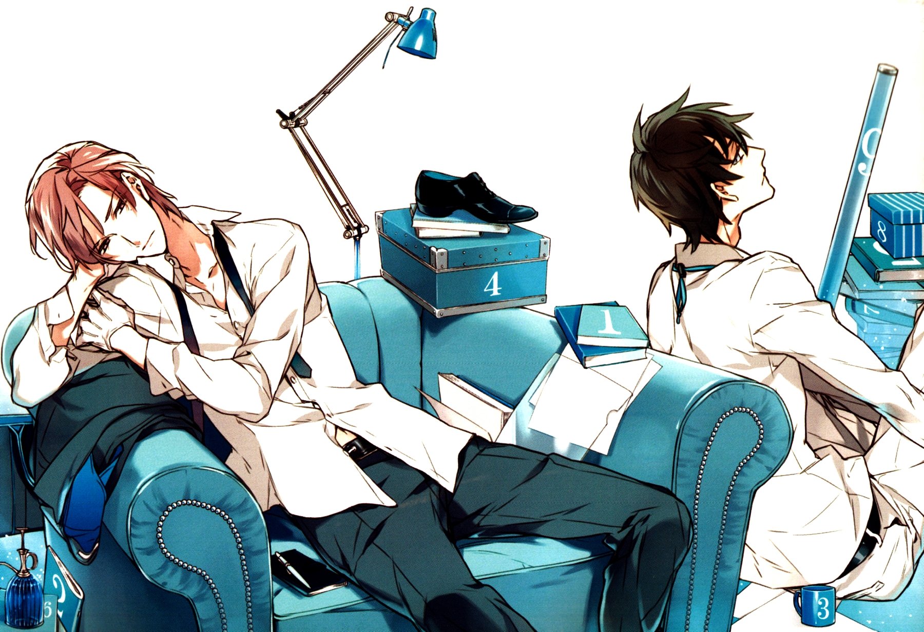 Description: A couple of people sitting on top of a blue couch next to each other on a white background with a blue chair.
