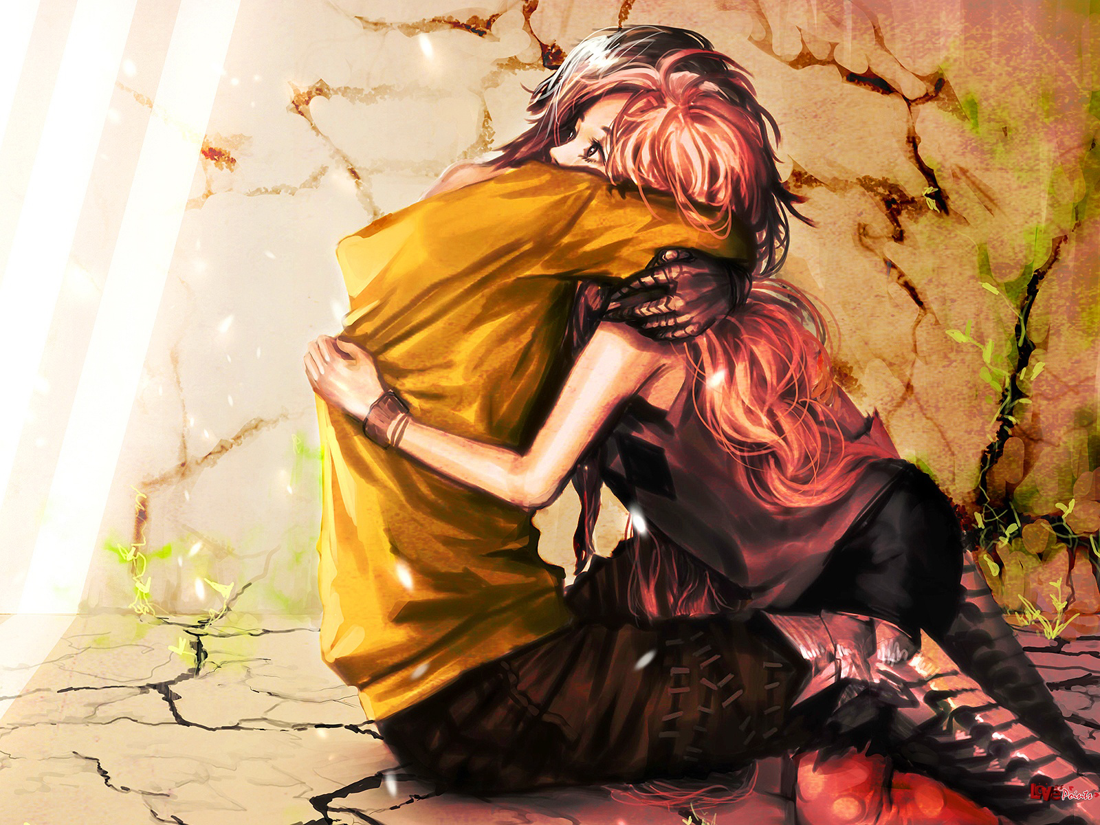 Description: A couple of people sitting on top of a floor next to each other on a floor covered in dirt.