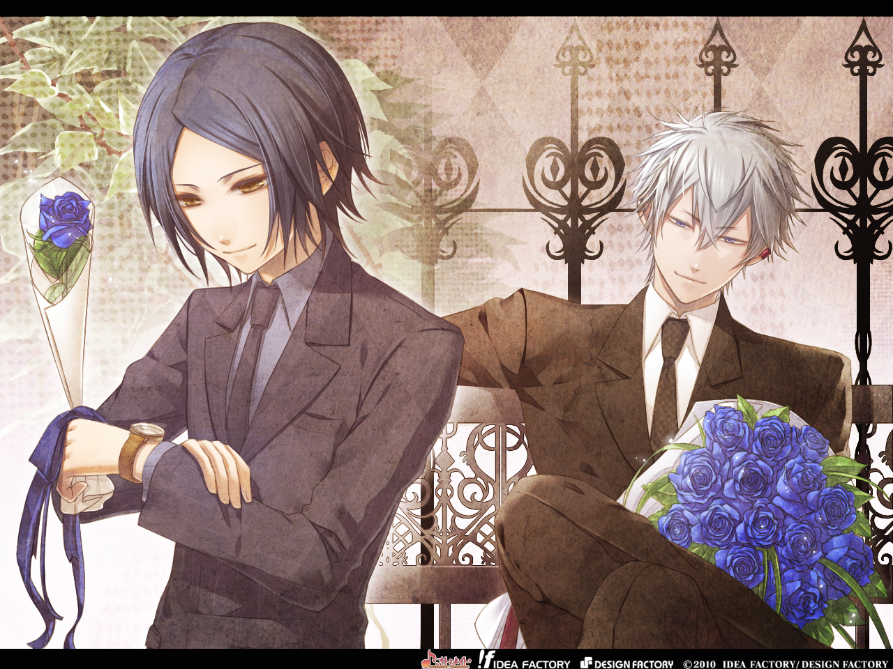 Description: A couple of people sitting next to each other near a fence and flowers in a vase with a blue rose.
