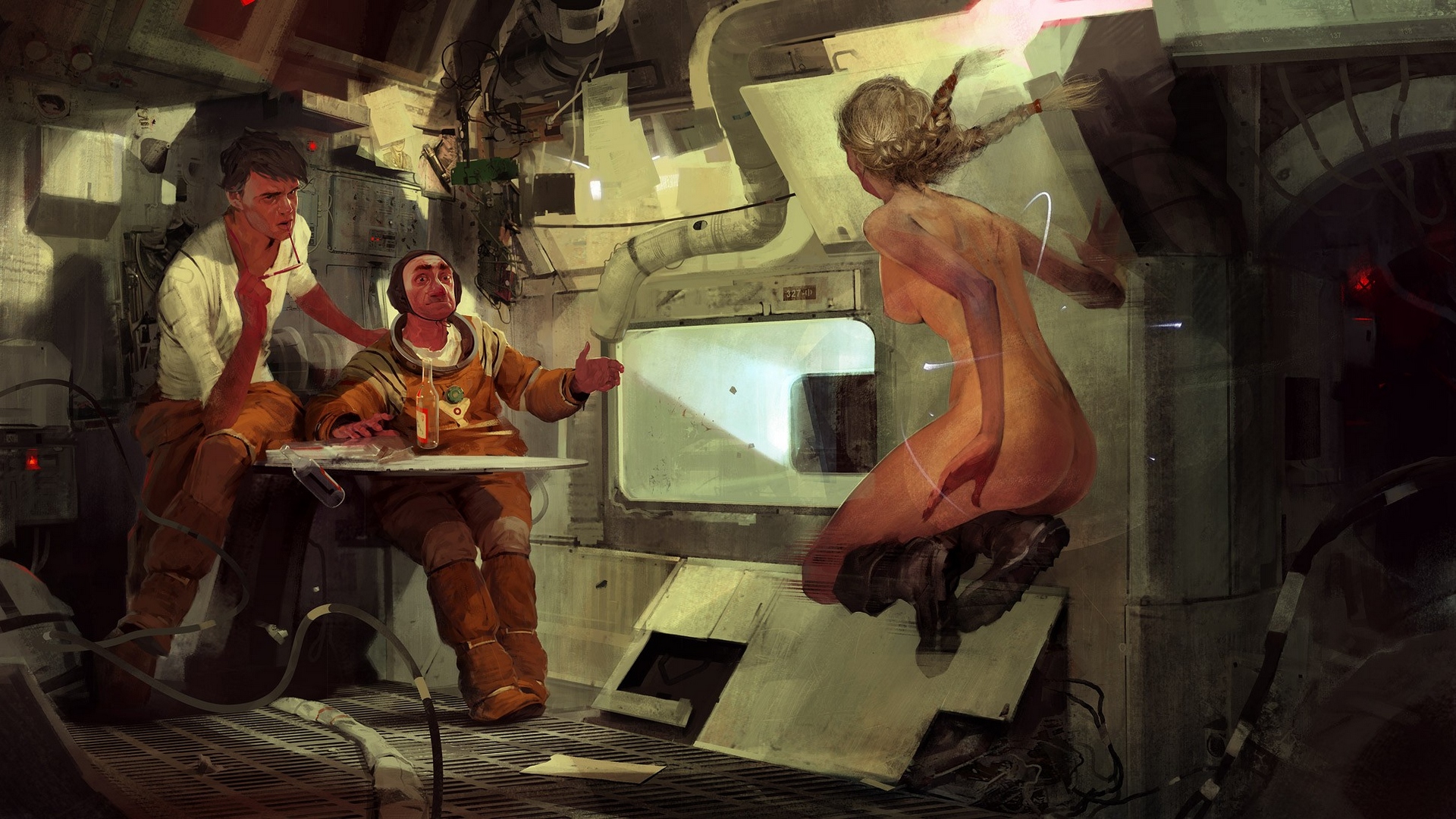 Description: A couple of people sitting at a table in a room with a tv and a mirror on the wall.