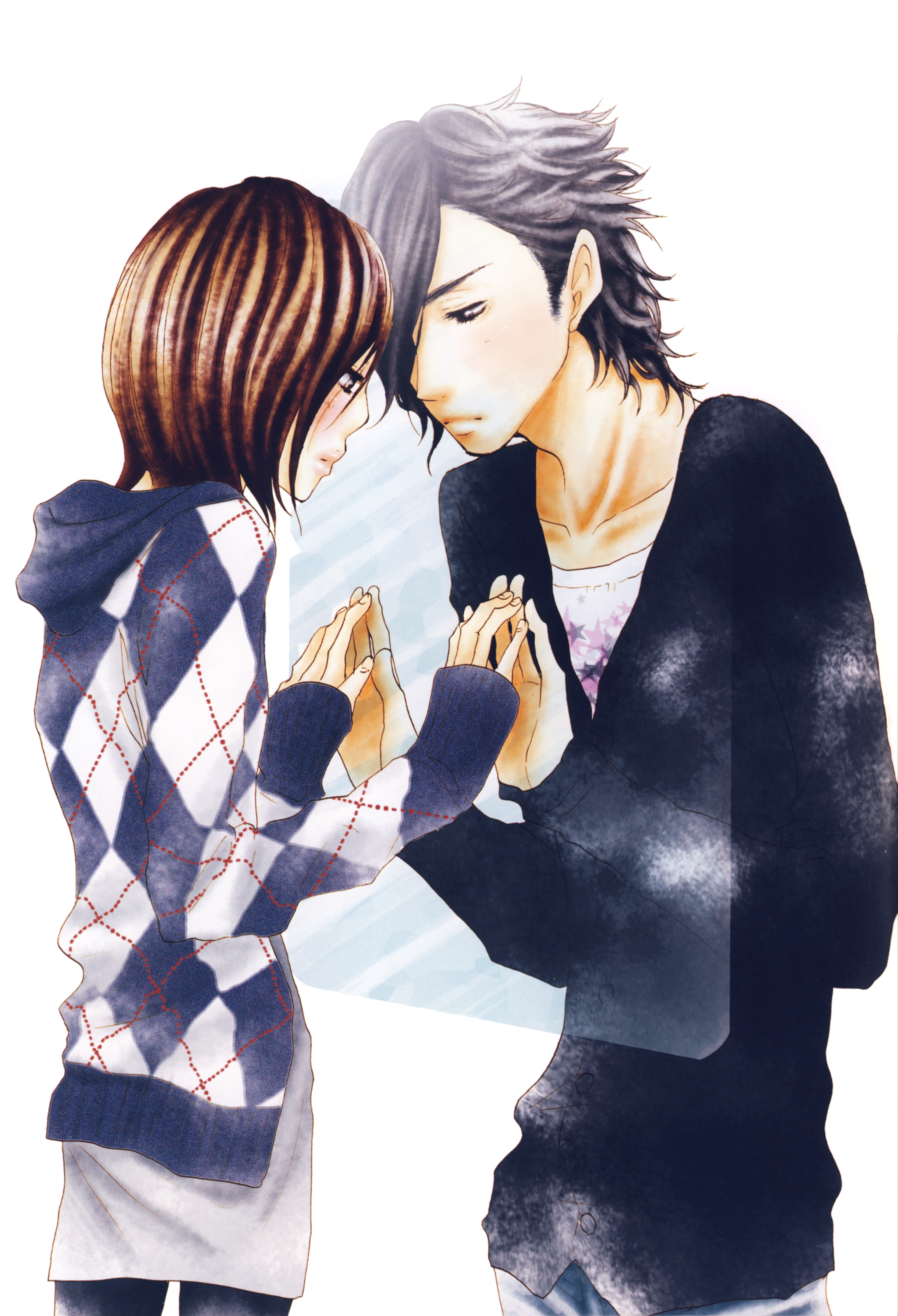 Description: A couple of people that are touching hands together in front of a mirror with a reflection of them on it.