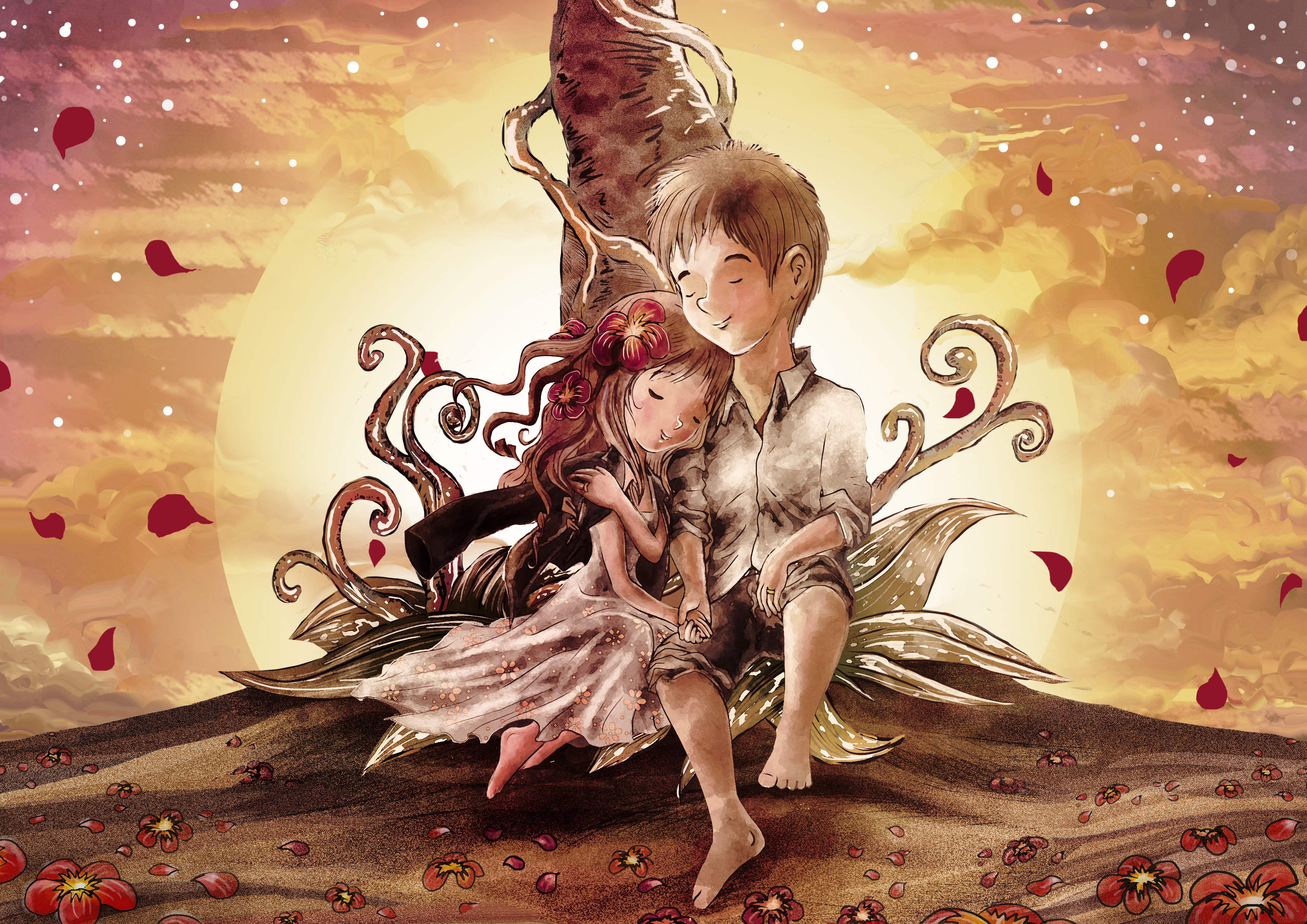 Description: A couple sitting on a tree branch with a full moon in the background and a red heart in the foreground.