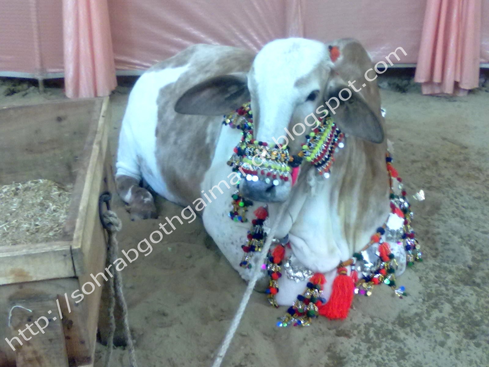 Description: A cow with a colorful beaded headdress and a wooden box in a barnyard with pink curtains.