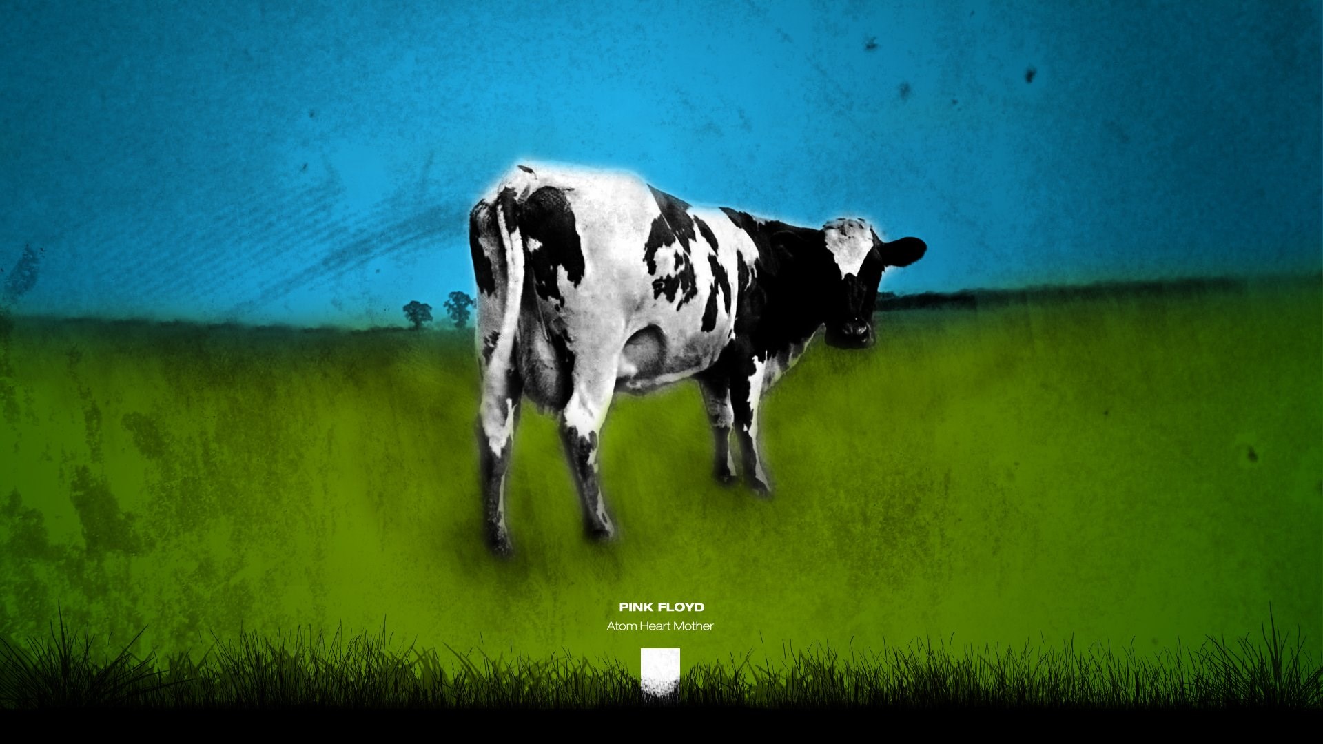 Description: A cow standing in a field of grass with a blue sky in the background and a green field with grass.