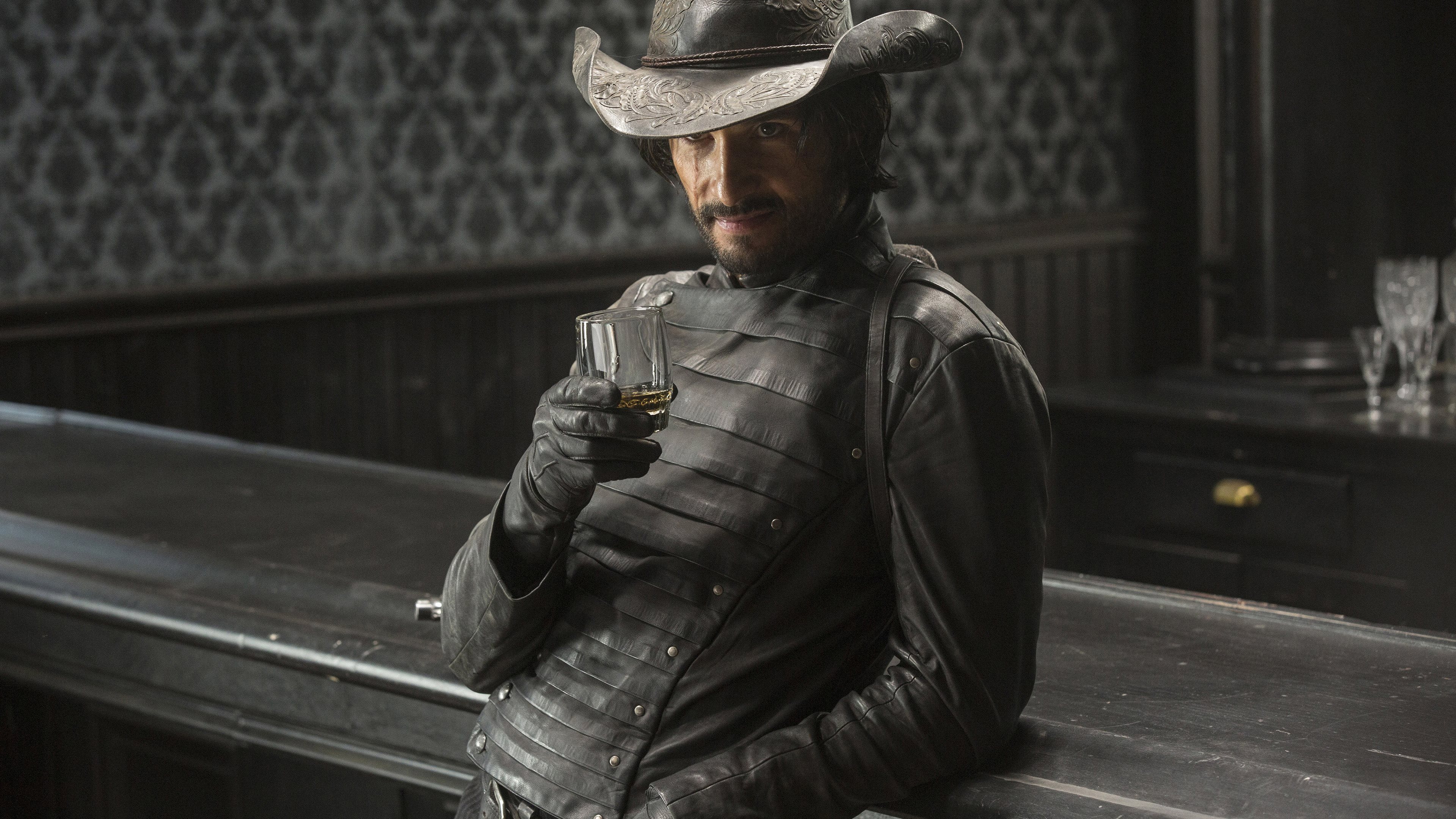 Description: A man in a cowboy hat holding a glass of wine in a bar area with a black wall and a black bench.
