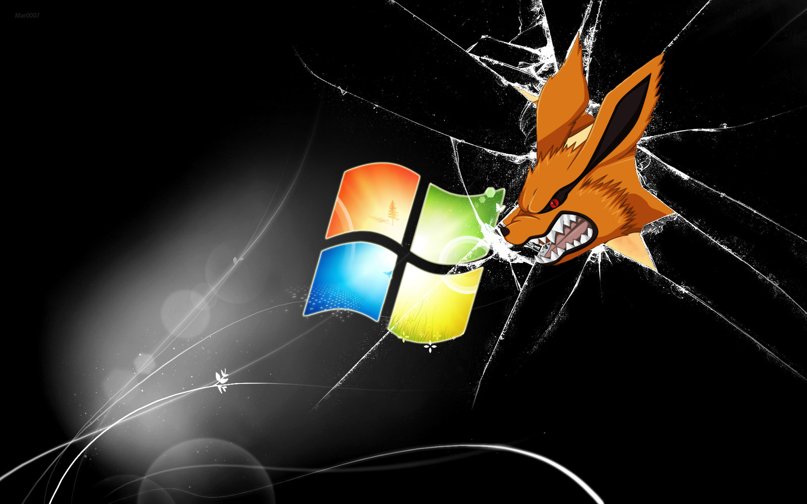 Description: A cracked window with a fox on it's face and a black background with white lines and a white swirl.