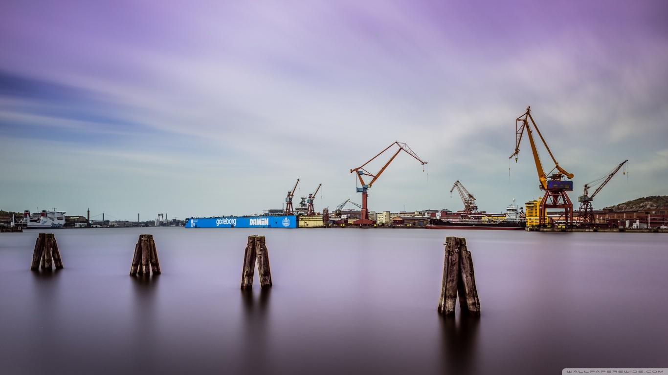 Description: A group of cranes that are sitting in the water near a dock with a blue container in the background.