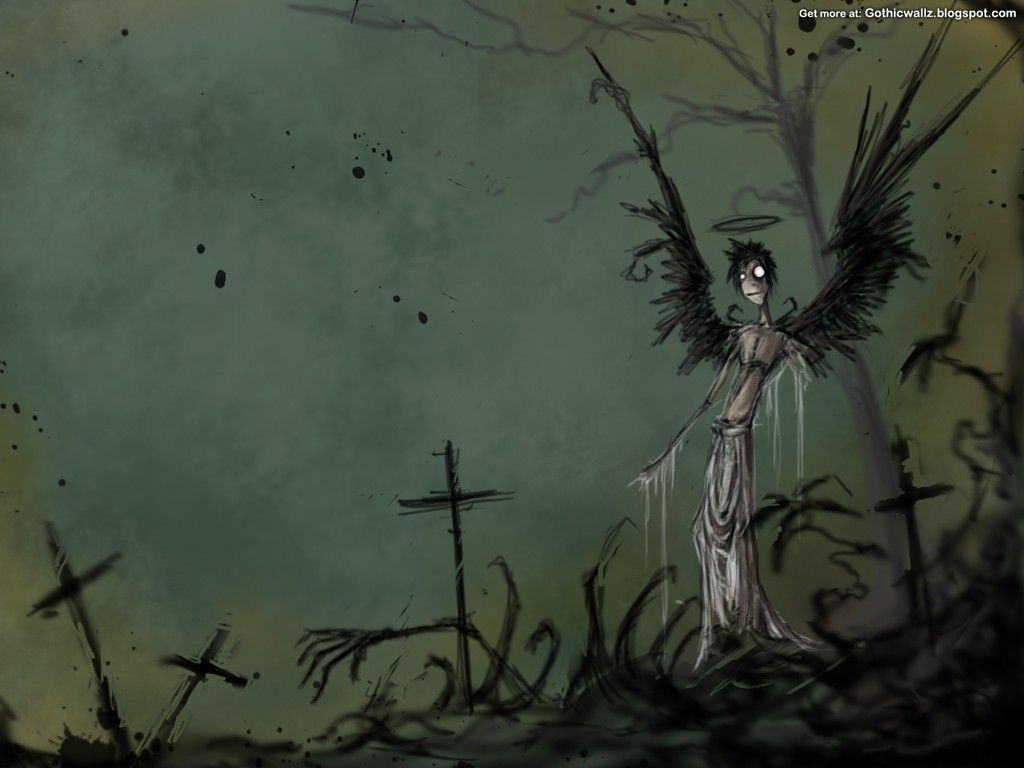 Description: A creepy angel standing in a field with a cross in the background and a tree in the foreground.