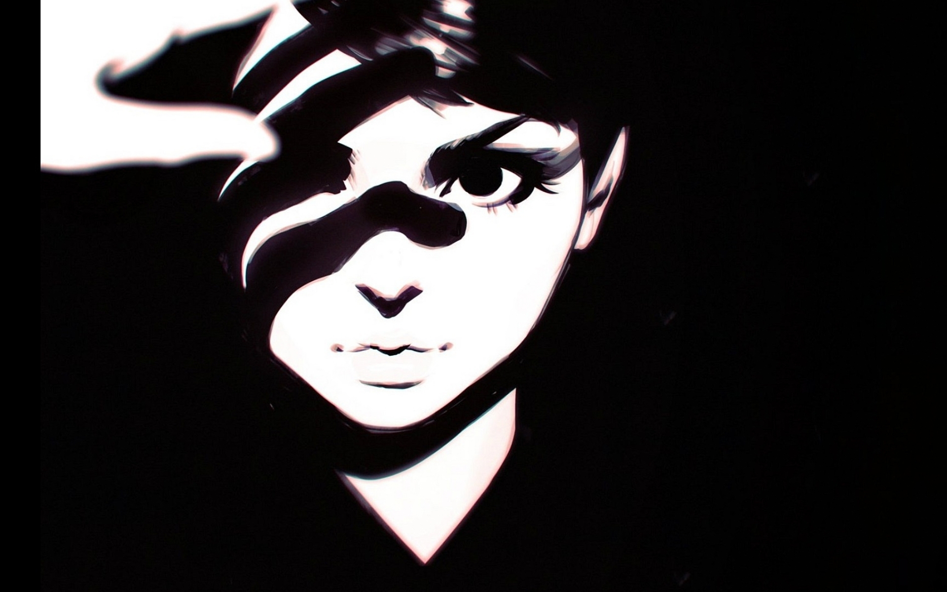 Description: A woman with a creepy clown make up on her face and a black background with a white clown face.