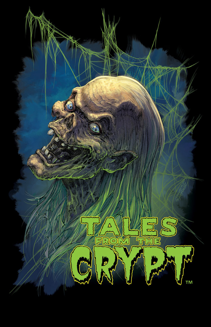 Description: A poster of a creepy creature with the words tales from the crypt on it's face and eyes.