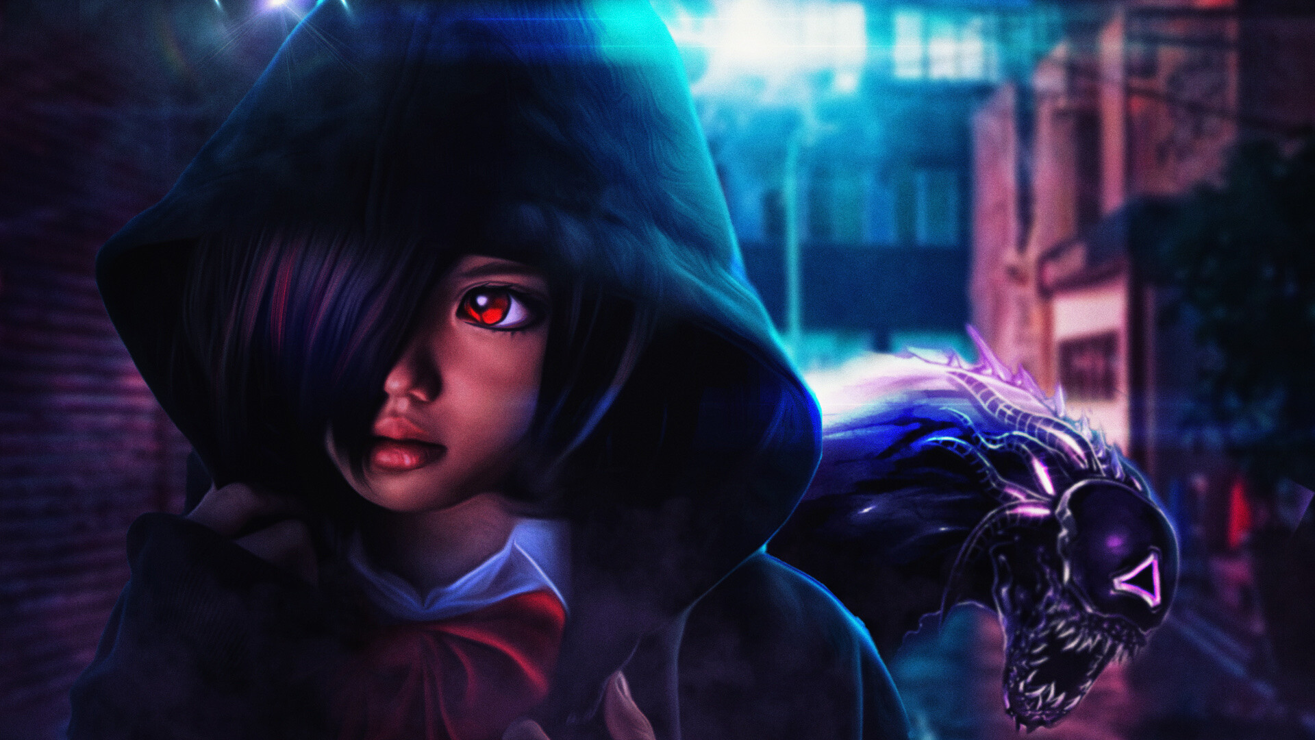 Description: A girl with a hoodie and a creepy face is staring at a creepy creature in the background of a city street.