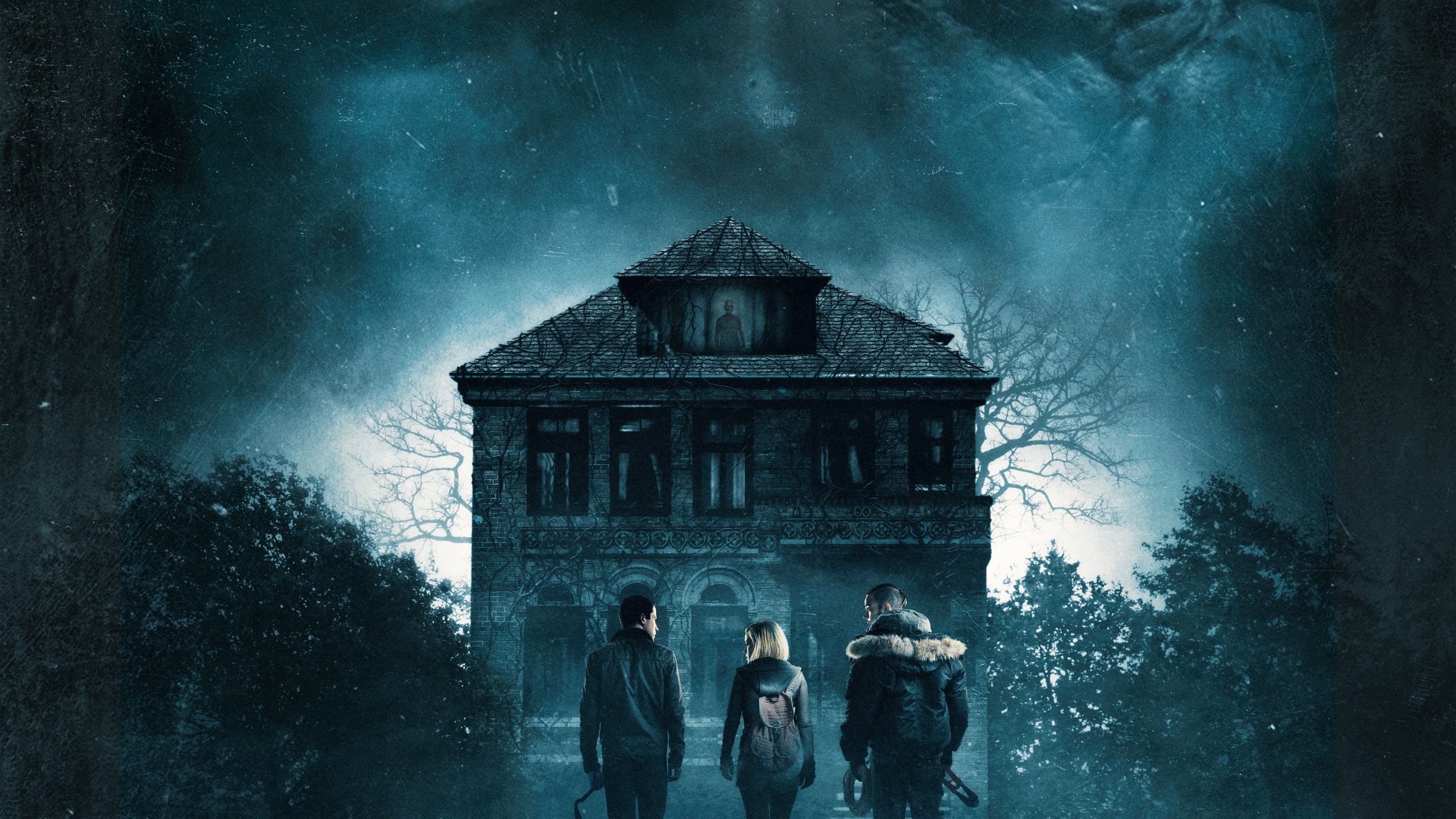 Description: A group of people standing in front of a creepy house on a dark night with a full moon in the sky.