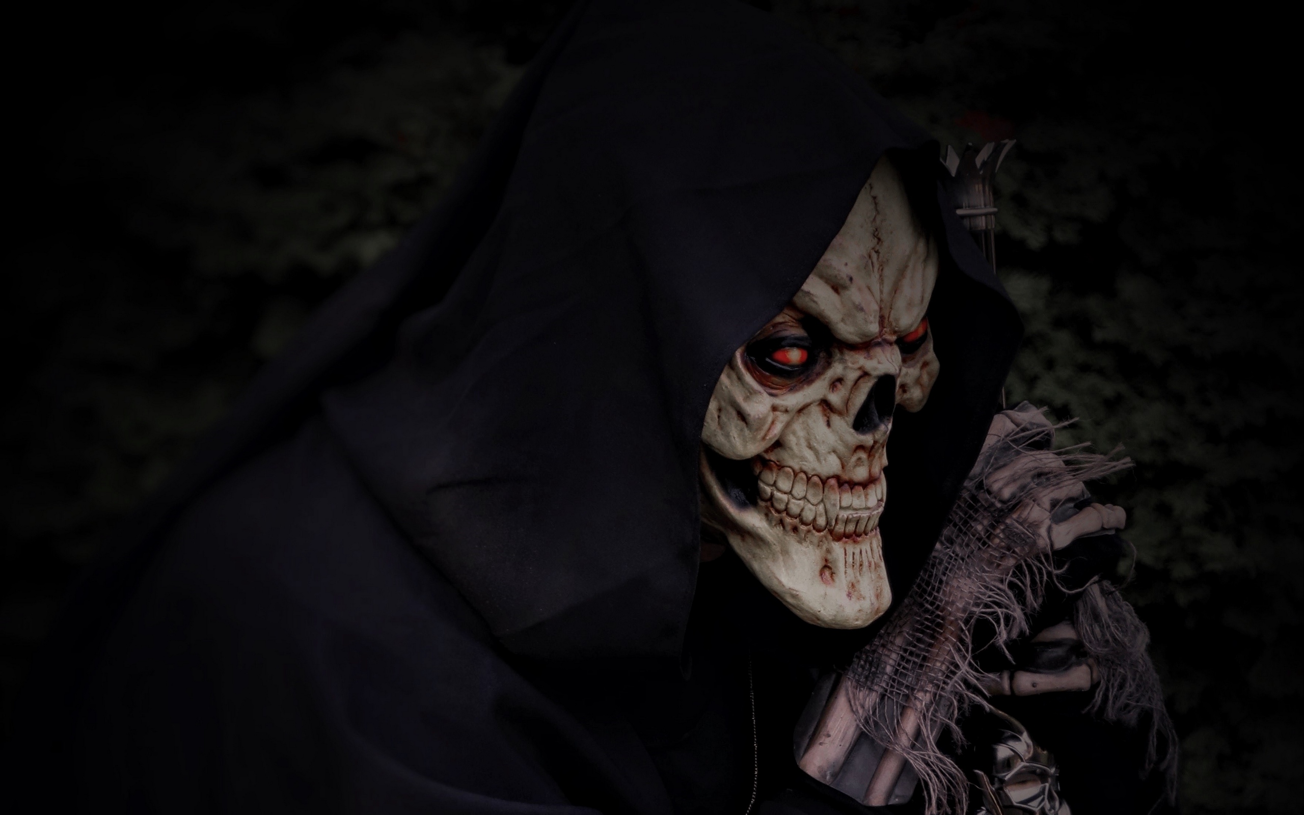 Description: A creepy skeleton wearing a black hooded jacket and holding a knife in his hand with a black hood on.