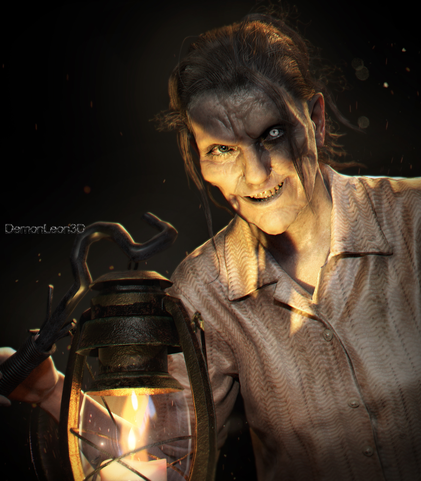 Description: A creepy woman holding a lantern with a glowing light on it's face and a creepy expression on her face.