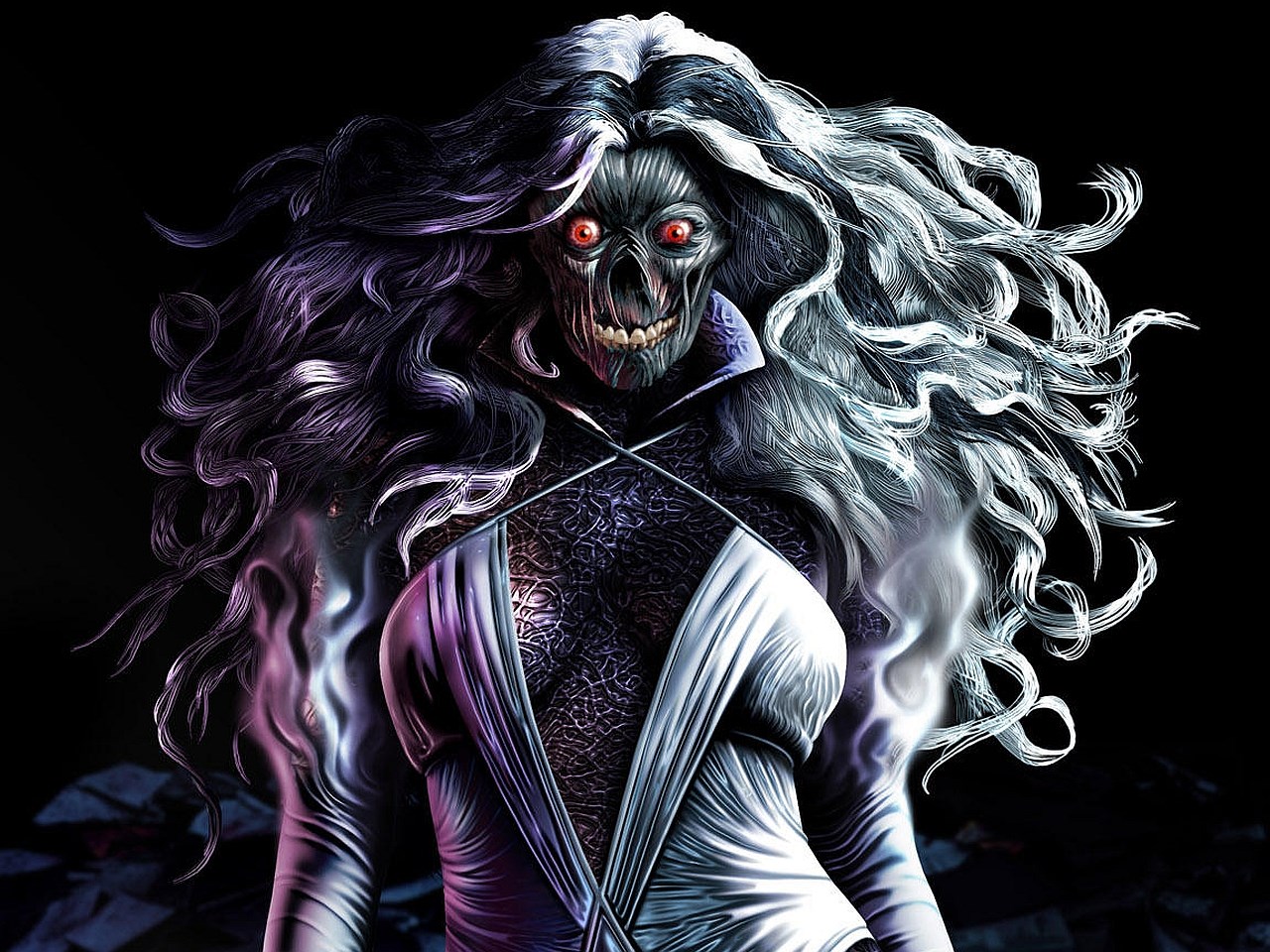Description: A creepy woman with long hair and a creepy face in a white dress with a black background and a black background.