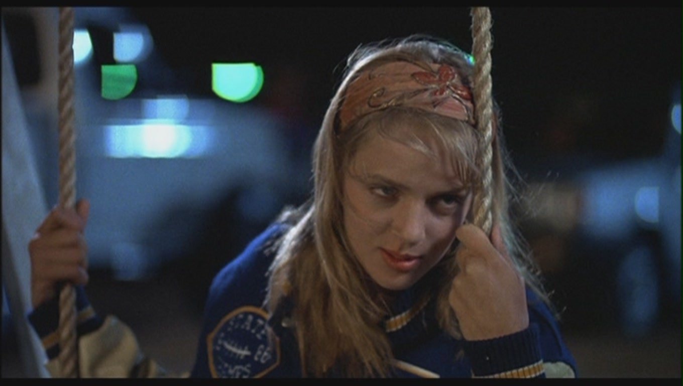 Description: A woman with a creepy look on her face on a swing in a dark room with a green light.