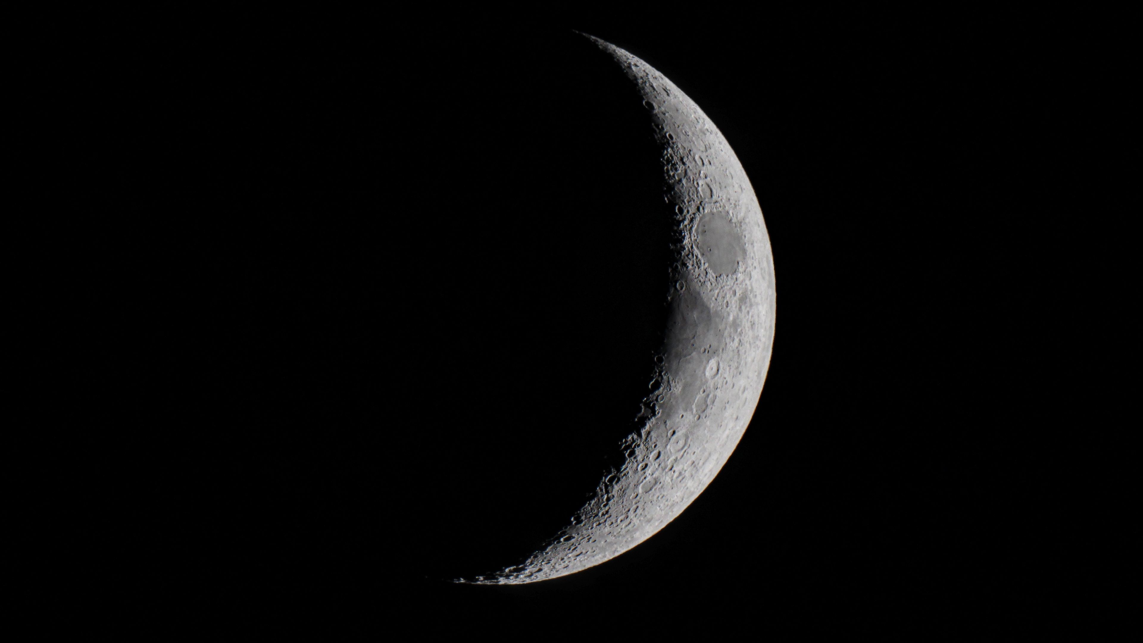 Description: A half moon in the dark sky with a black background and a small white dot on the side of the moon.