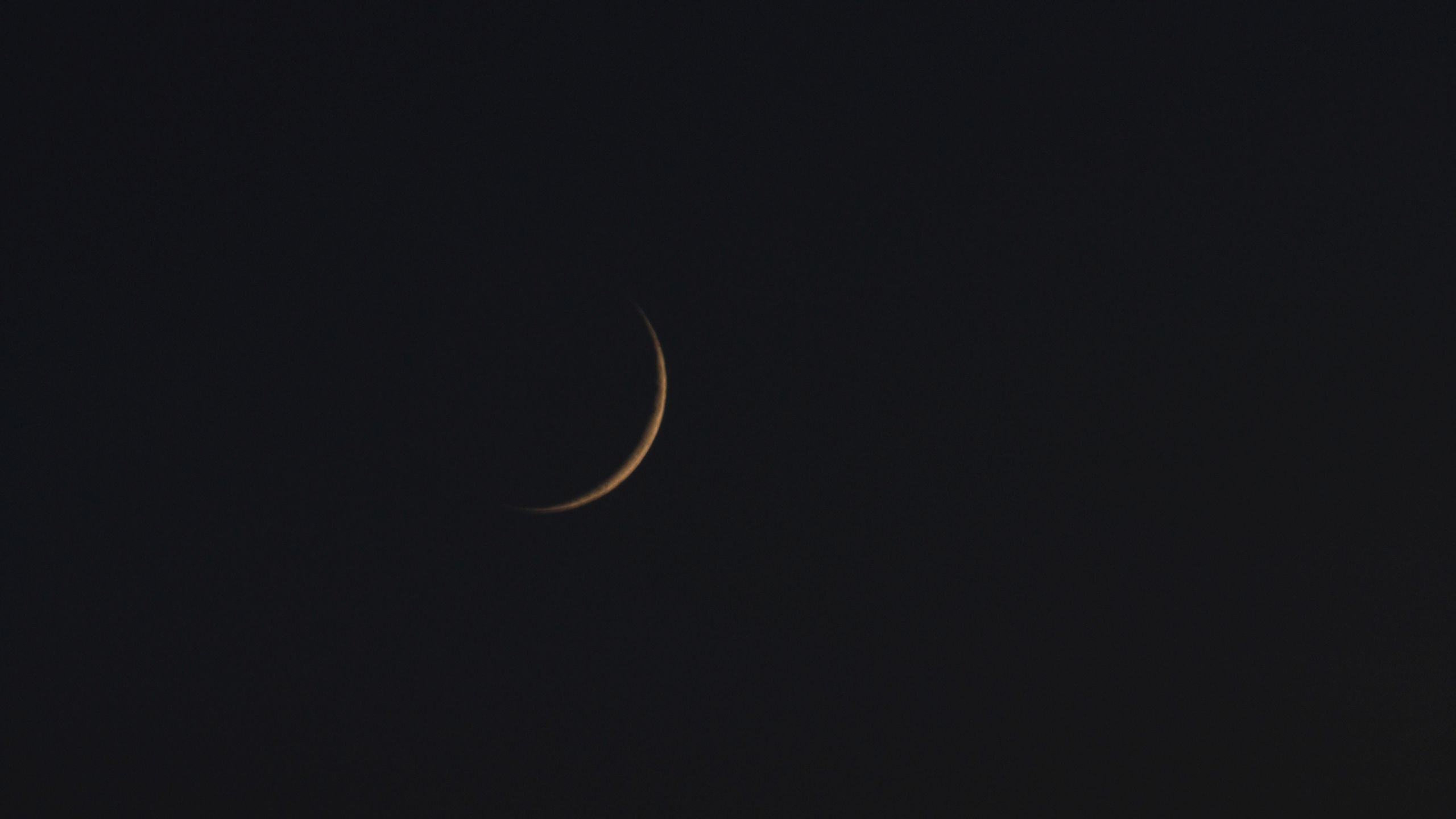 Description: A crescent moon is seen in the dark sky above a building in the distance.