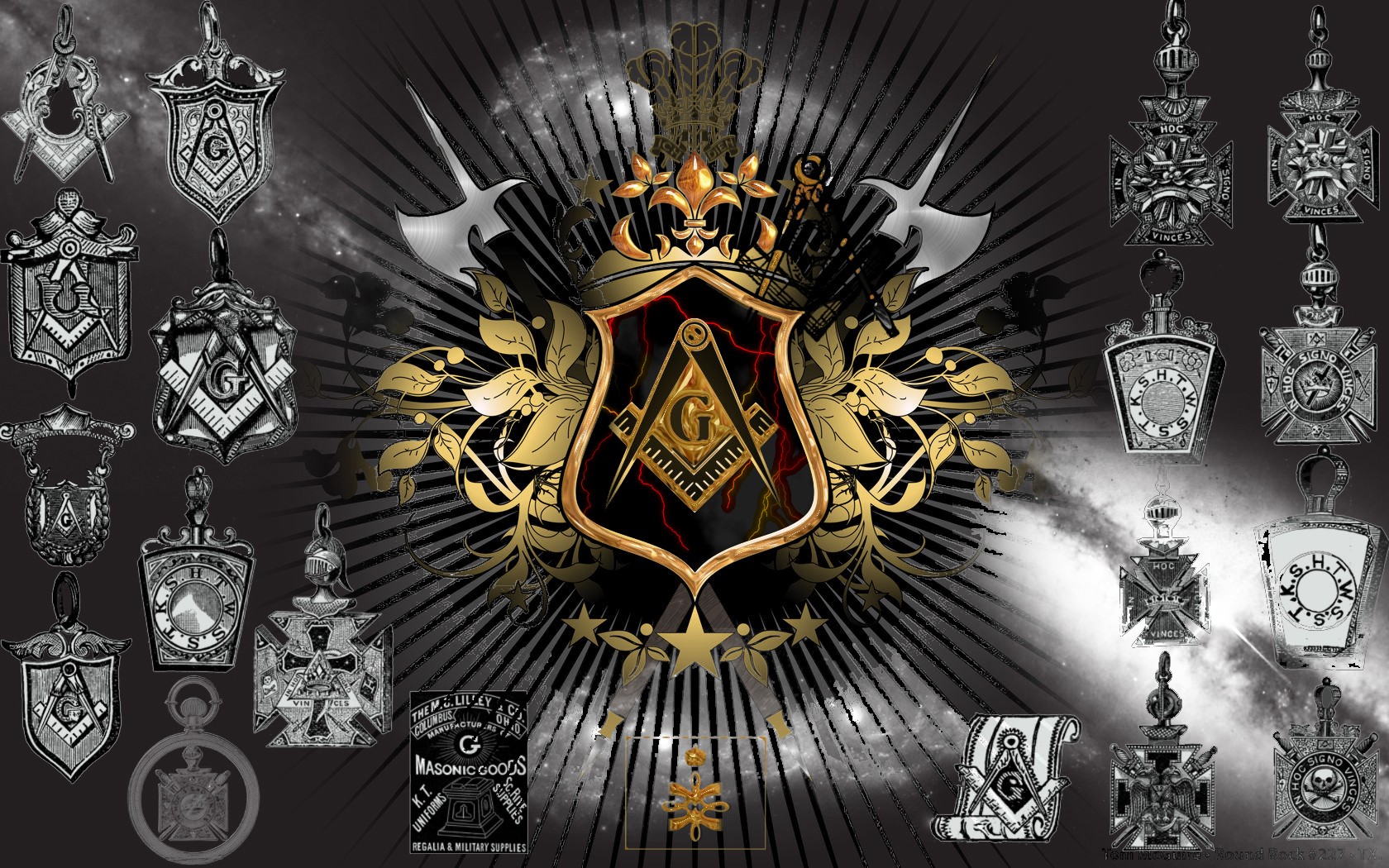 Description: A large collection of crests and badges on a black background with a gold crown on top of them.