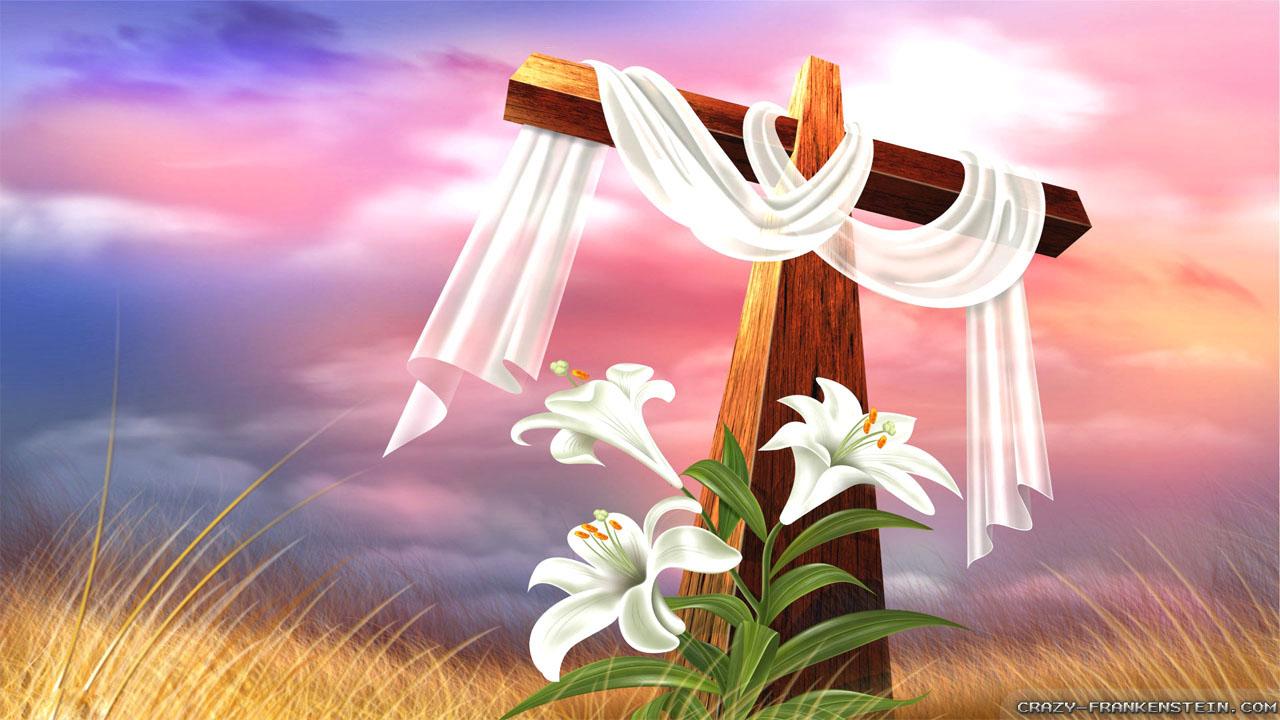Description: A cross with a white cloth draped over it and flowers in the foreground.