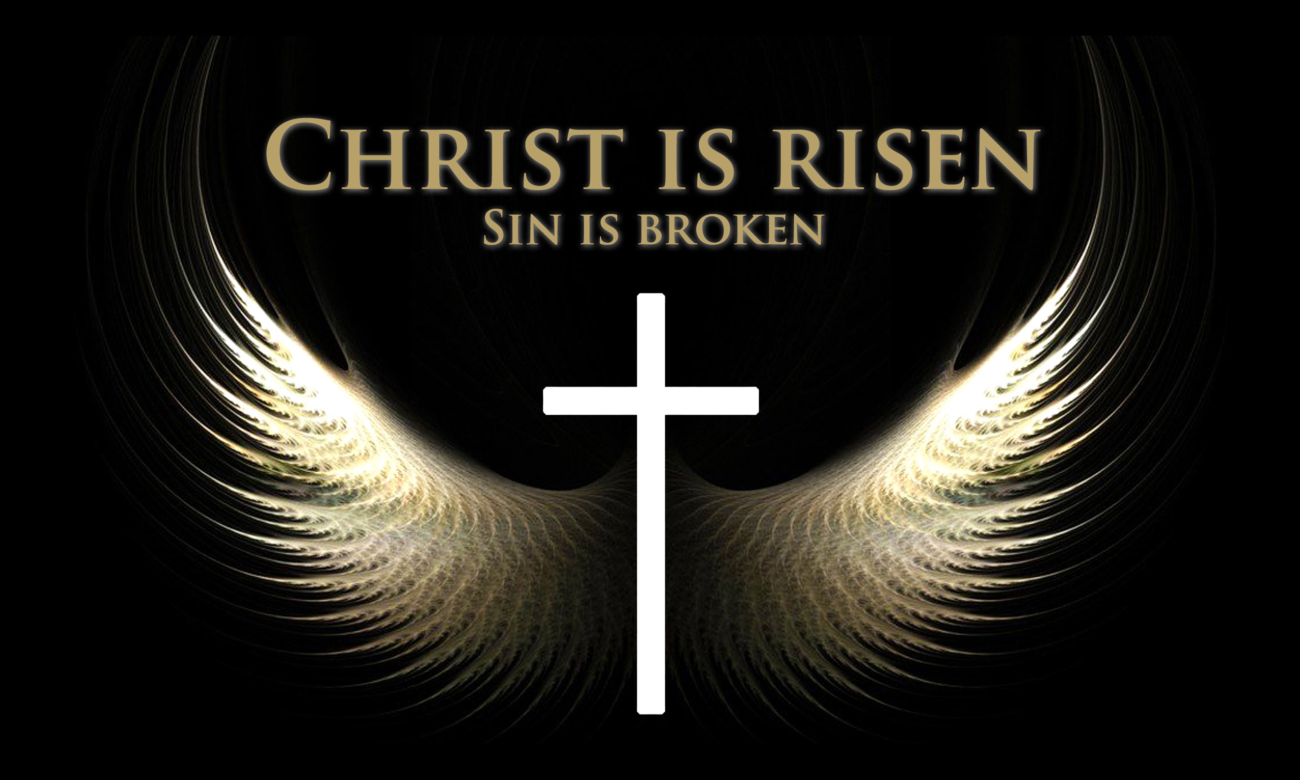 Description: A cross with wings and a quote about christ is risen sin is broken on it.
