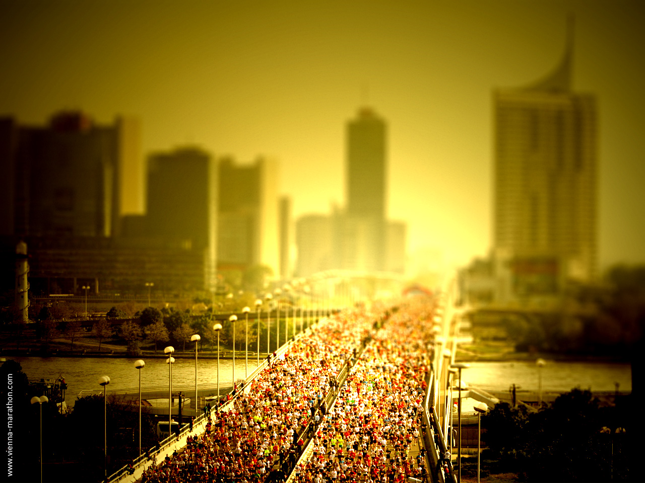 Description: A large crowd of people are standing on a bridge in a city with tall buildings in the background and a yellow sky.