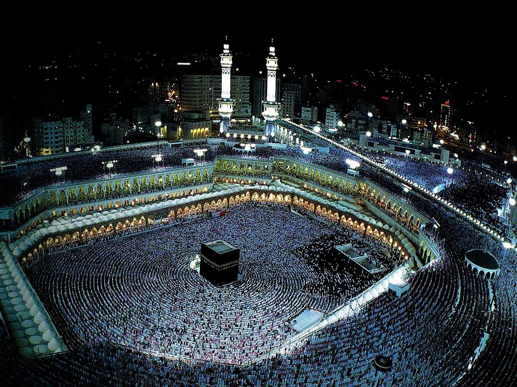 Description: A large crowd of people in a large building at night with lights on the ground and a large building in the background.