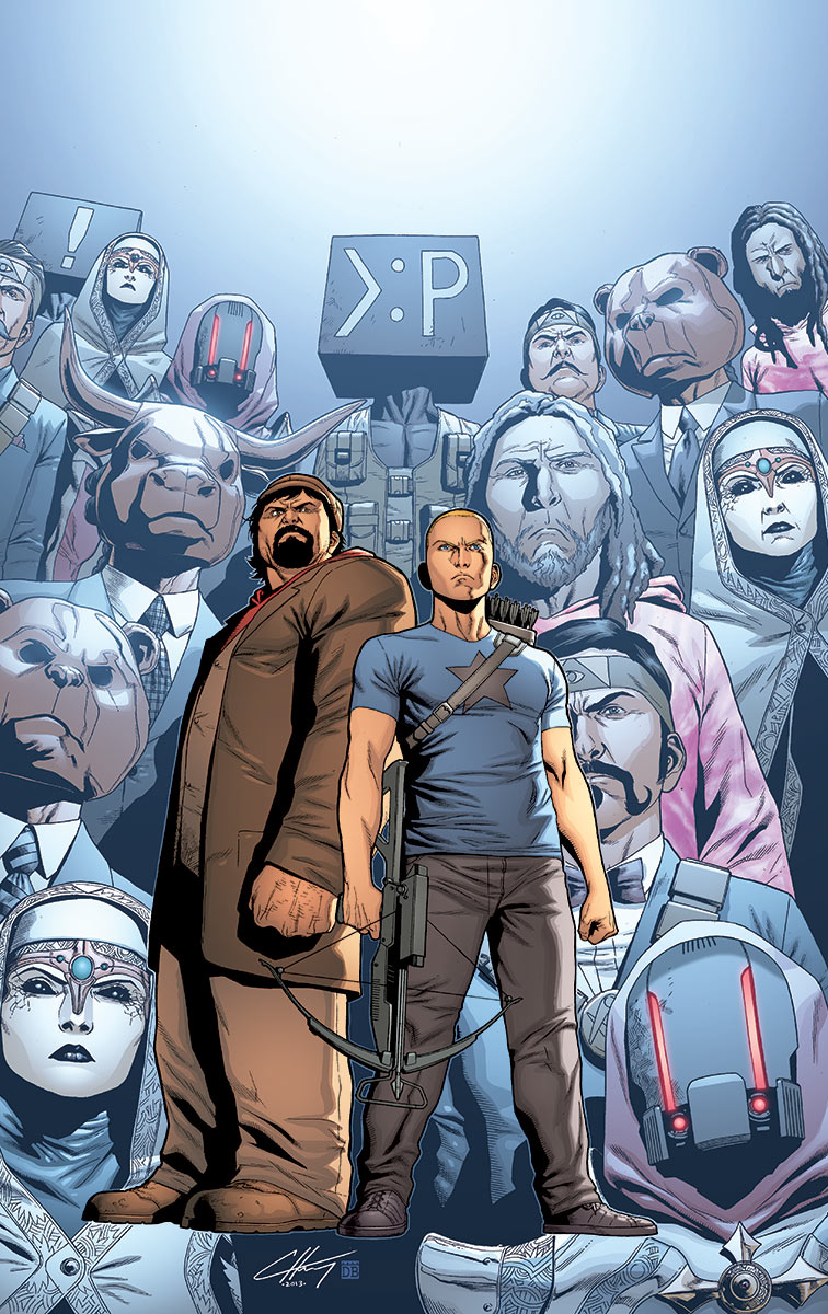 Description: A group of people standing in front of a crowd of people with guns and helmets on their heads and one man with a gun.