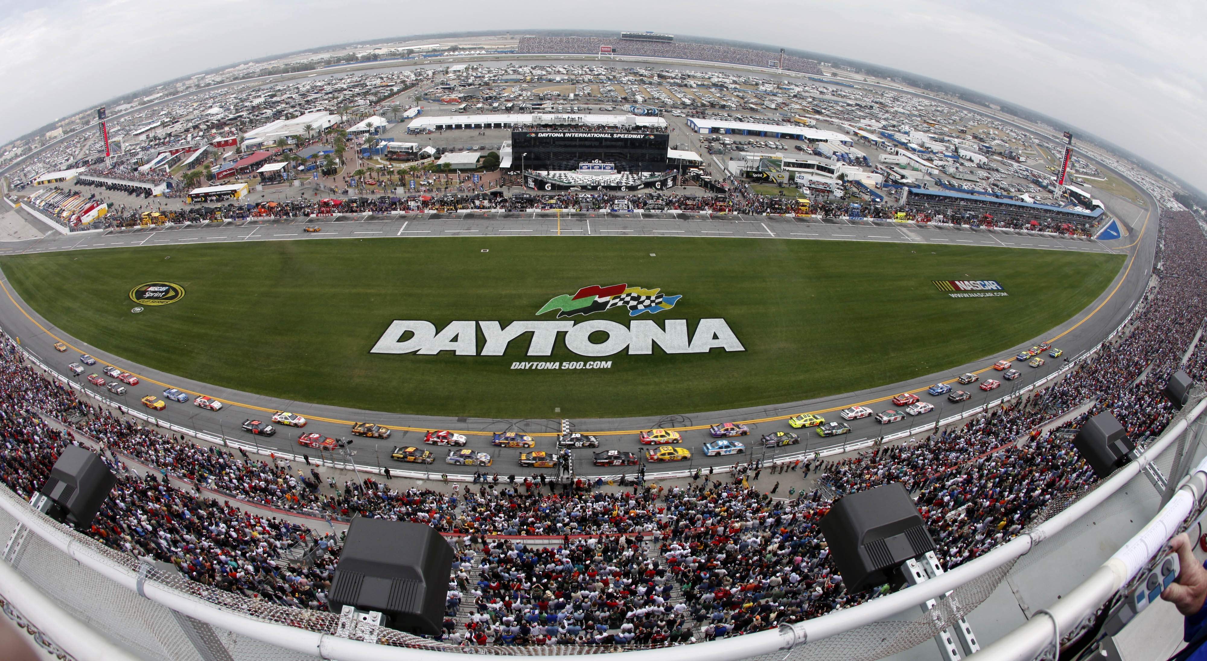 Description: A large crowd of people watching a race on a track with a daytona sign in the middle of the field.