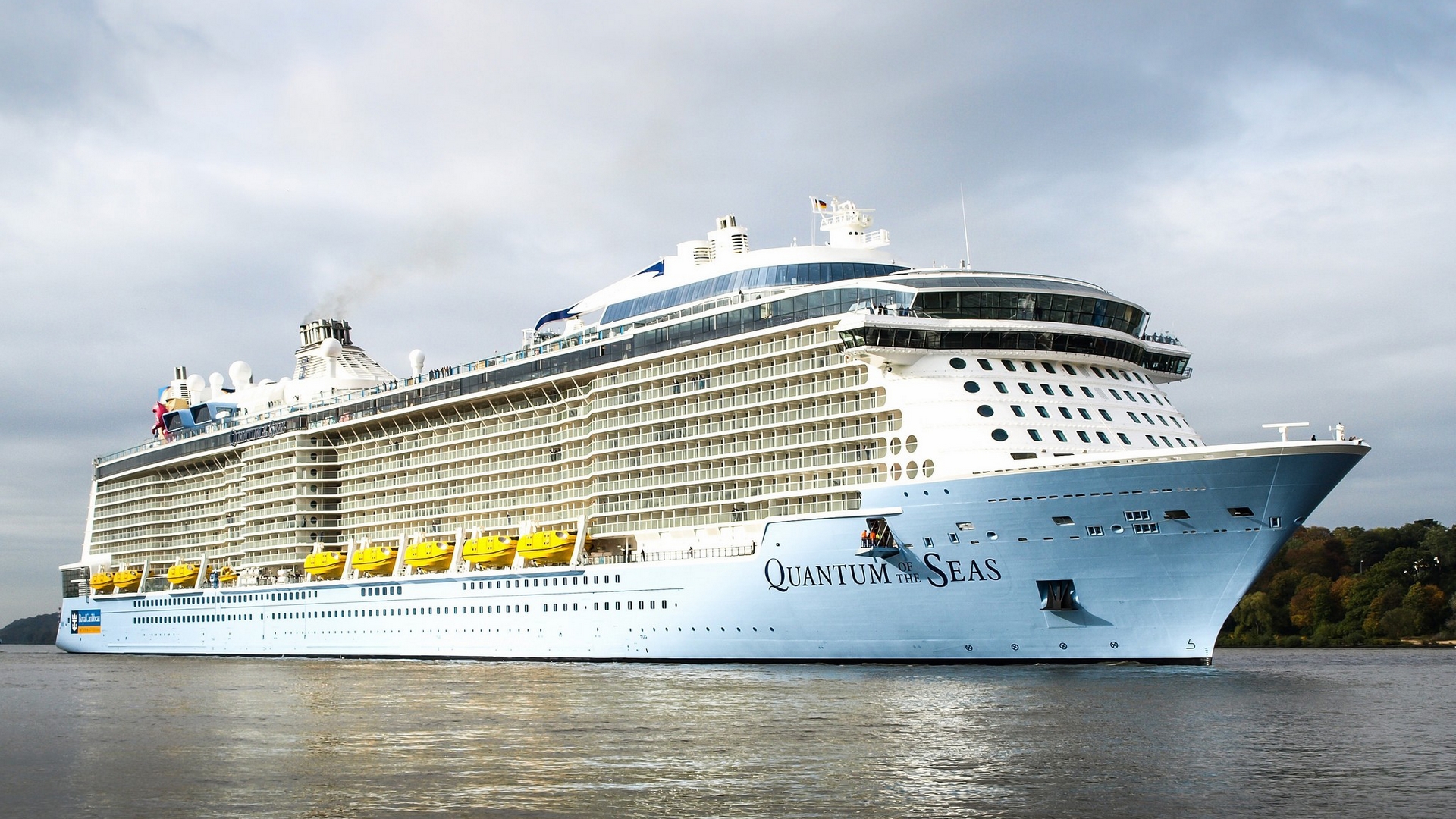 Description: A large cruise ship in the water with a cloudy sky above it and a few people on the deck.